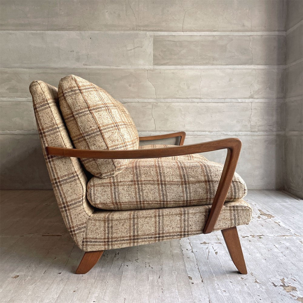 レトロな雰囲気を醸し出す暖色系のチェック柄のファブリックも魅力的です。ざっくりとした編み込みで起毛のある生地感。ウォールナット材フレームとの組み合わせが抜群で、よりナチュラルな印象を与え、木味を用いた空間に映えます。