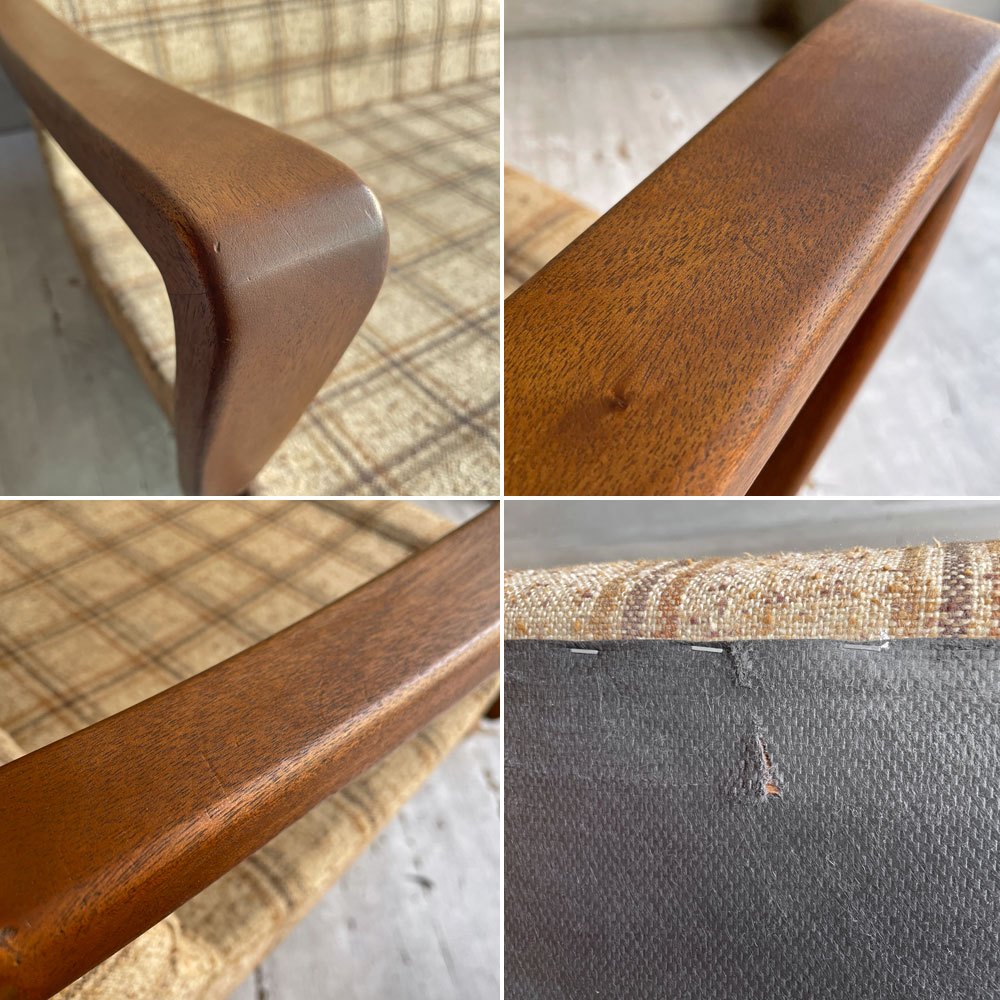アーム及び脚部の傷や擦れ、ファブリックに素材特有の毛羽立ちがございます。また、背クッションのひとつに当て布による補修が行われております。当て布側を裏にしてお使い頂ければ普段は見えない箇所となります。その他、本体底面の不織布に軽微な破れのある個所がございますが、大きく美観を損なうようなダメージなども無く、クッションのへたりなどもございません。USED品として概ね良好なコンディションを保っております。