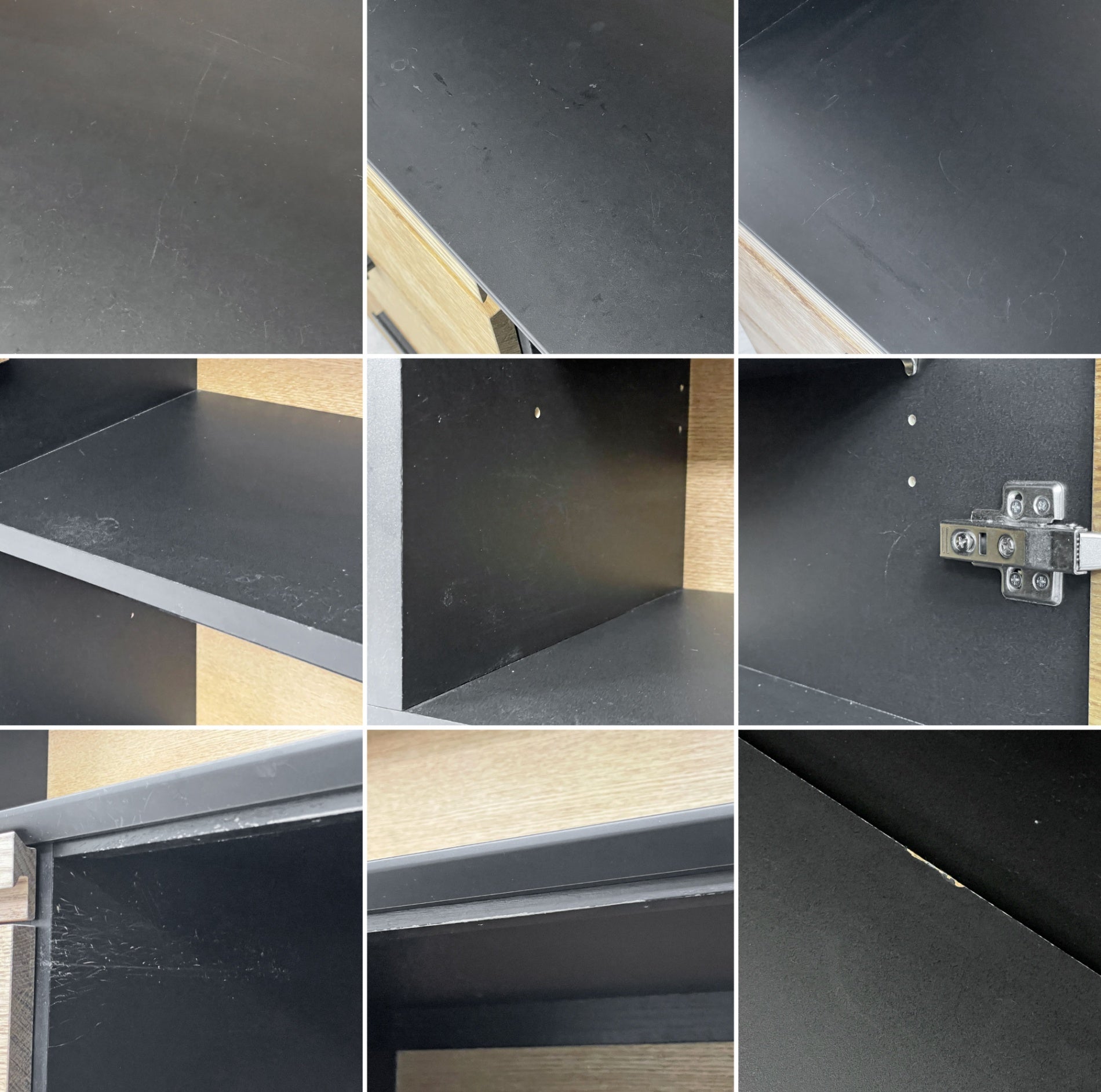 使用に伴い、メラミン化粧板部分には擦れや傷、くすみ、ペイントロスが散見され、ステンレス部にはスクラッチ傷、素材特有のくすみ、スライド天板には一箇所表面の剥がれが見受けられます。