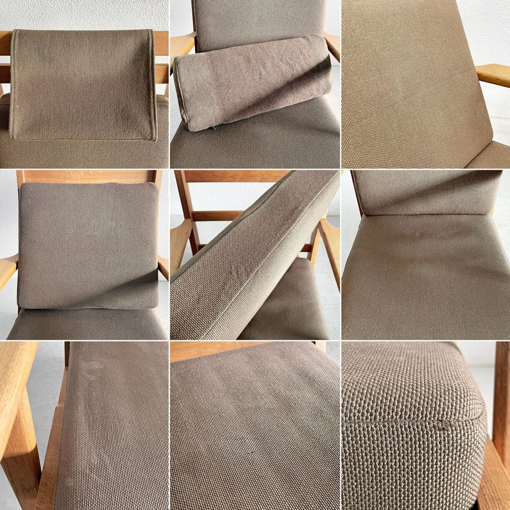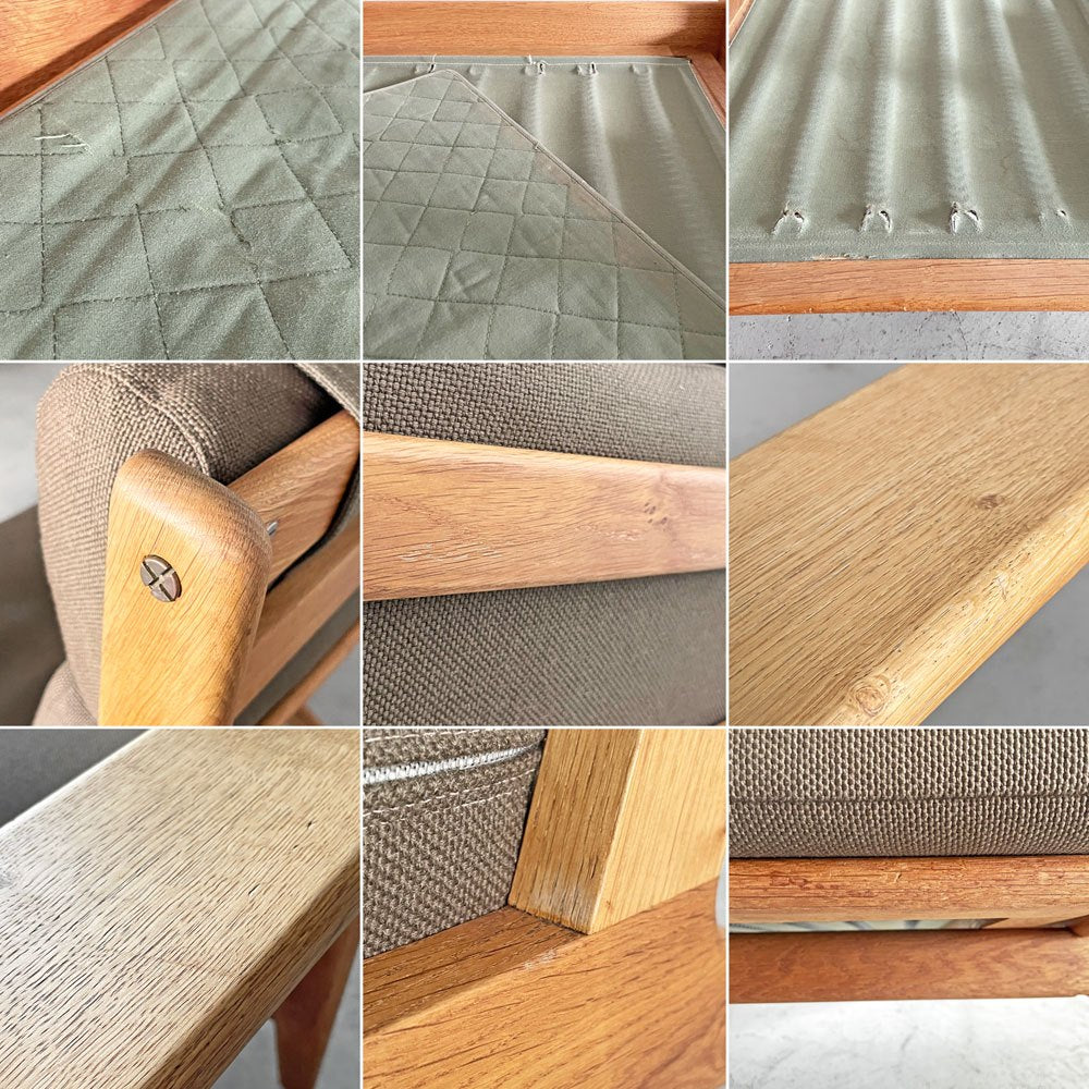 こちらはビンテージのお品物です。フレームには擦れや傷、打痕、木色のムラや黒ずみ、シミ汚れ等が見受けられますが、いずれも著しく美観を損ねるダメージではございません。また、ファブリックにはヤケによる色味の差が随所に生じているとともに、背座カバーを中心に薄っすらとした白いシミ汚れが確認できます。その他、若干の毛羽立ち、ほつれや破れなどがキルティングシートや座面裏地にもございますが、オリジナルファブリックの風合いとしてお楽しみくださいませ。なお、ヌードにややへたりがありカバーにシワが生じますが、スプリングコイルに問題はございません。金属パーツの錆など経年なりの傷みも味わいとなり、これからも安心して実用いただけるコンディションを保っております。
