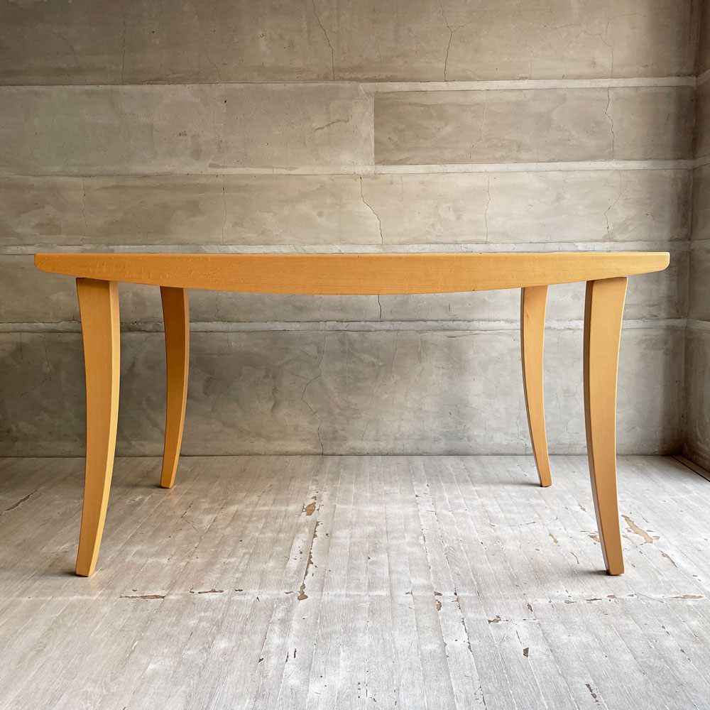 また脚部は根元から先端にやや細くなり、そして緩やかな外側への曲線となっており、動物のような可愛げが感じられるデザイン。天板端もカーブがかかっている為、やわらかく優しい雰囲気のダイニングテーブルとなっております。