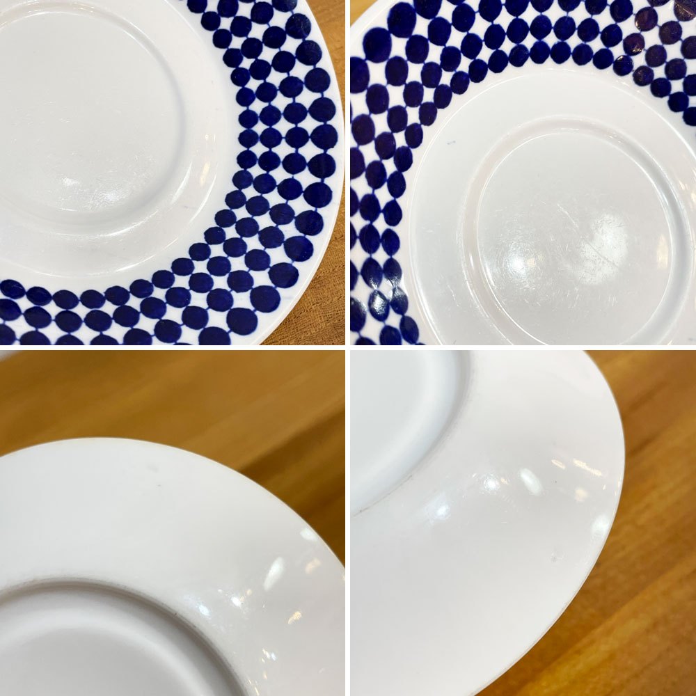 こちらは、ビンテージのお品物となります。使用・経年に伴い、傷や擦れ、線傷によるクスミ、落としきれない黒ずみや着色がございます。また、カップやソーサーの底面に僅かなチップがございます。ビンテージなりのダメージはございますが、実用に問題となる割れといったダメージは無く、これからも安心してご使用いただけるコンディションを保っております。
