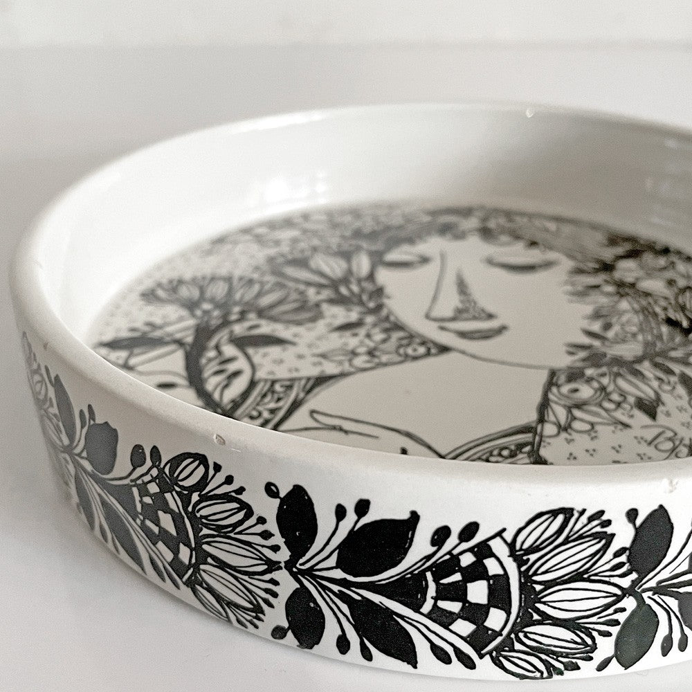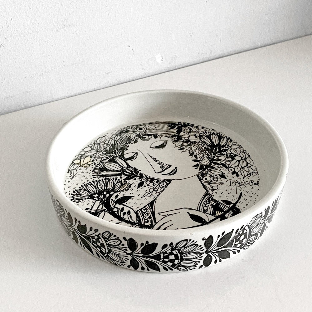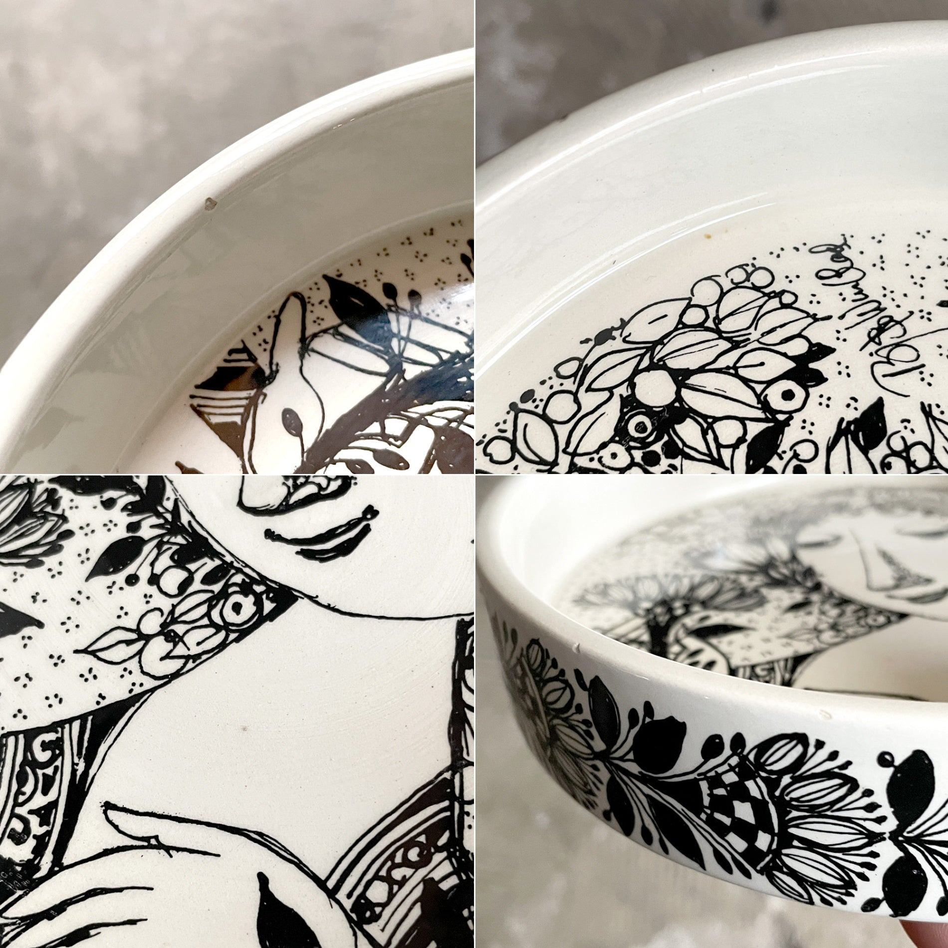 こちらは白地に黒の繊細な線で描かれた、女性と花のモチーフが印象的なビンテージのリムボウル。