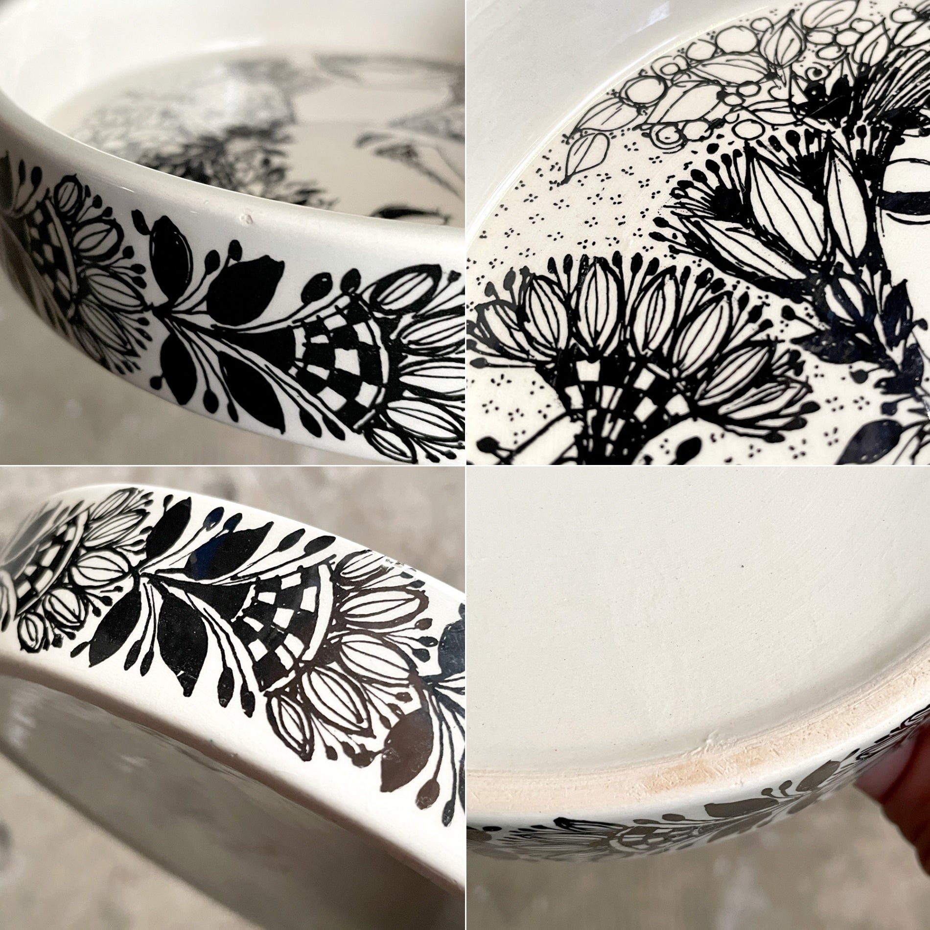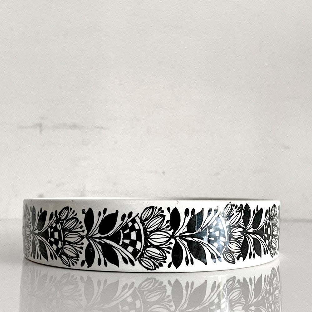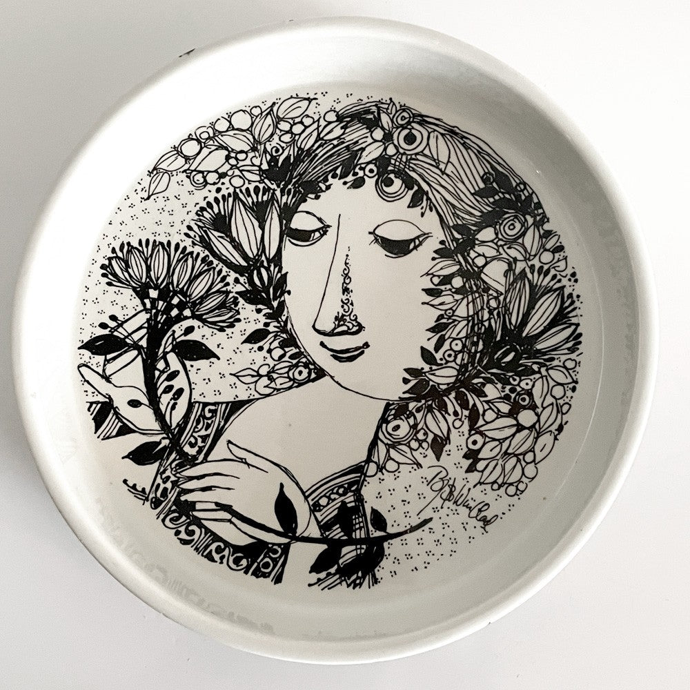 こちらは白地に黒の繊細な線で描かれた、女性と花のモチーフが印象的なビンテージのリムボウル。