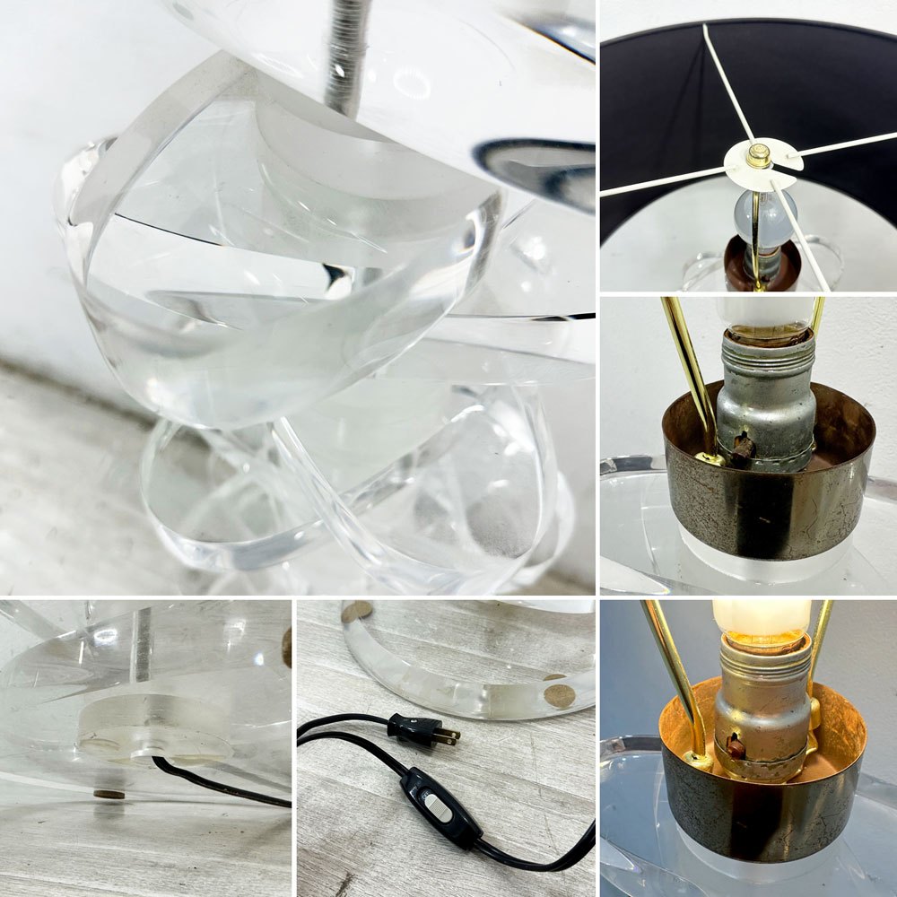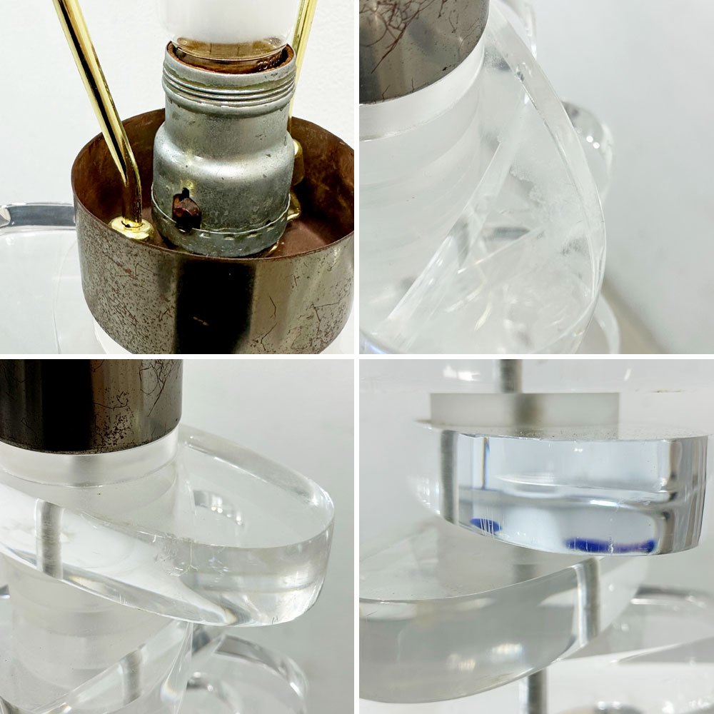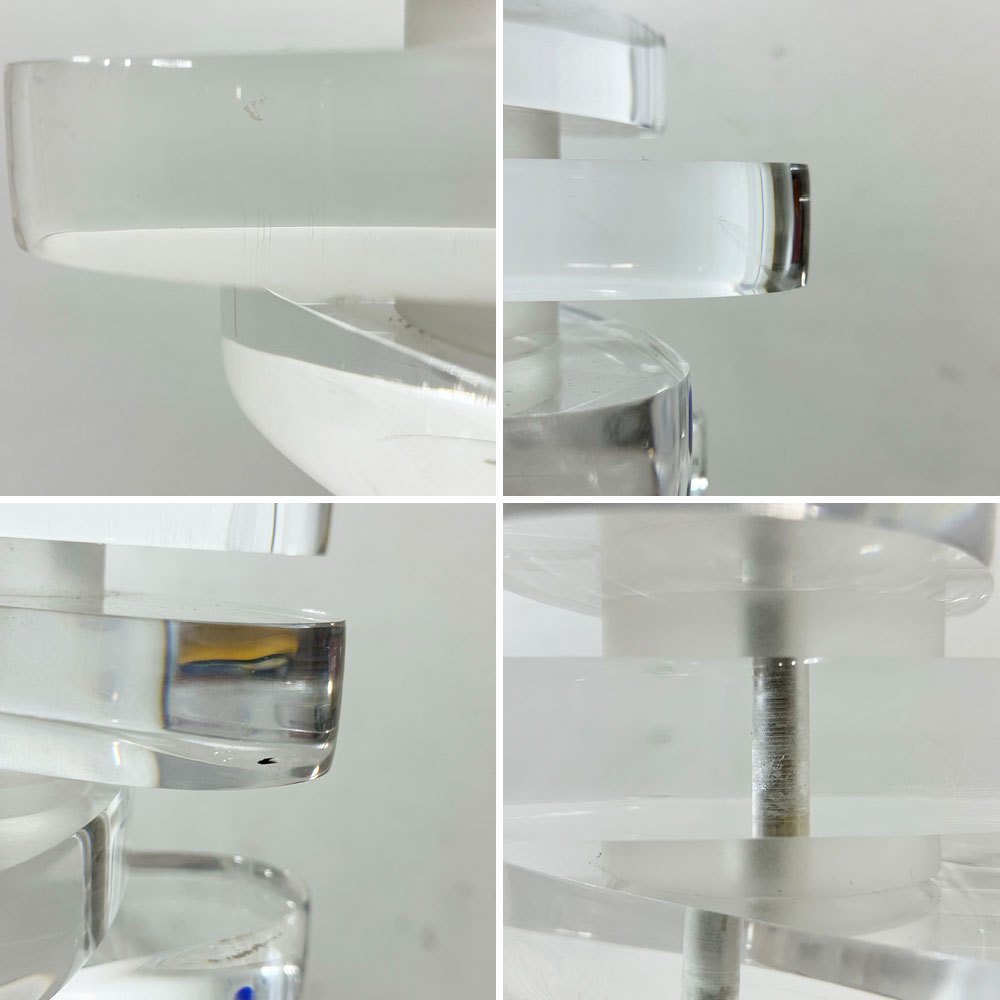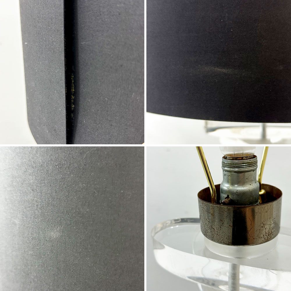 こちらは、ビンテージのお品物となります。使用・経年に伴い、シェードには接着の剥がれや擦れ、ソケットにはくすみや錆、アクリルには傷や線傷、欠けや材特有の亀裂痕、落とし切れない汚れがございます。また、ベース部分には透明のゴムクッションが貼られておりましたが、数箇所欠品して自立しなくなっていた為、硬質フェルトを貼って代用しております。なお、アクリルを回転させるとネジの締まりが緩くなり傾むいて倒れてしまう可能性がございますので、必ずソケット部分を抑えてネジを締めるようにしてくださいませ。その他、実用に問題となるダメージは無く、これからも安心してご使用いただけるコンディションを保っております。