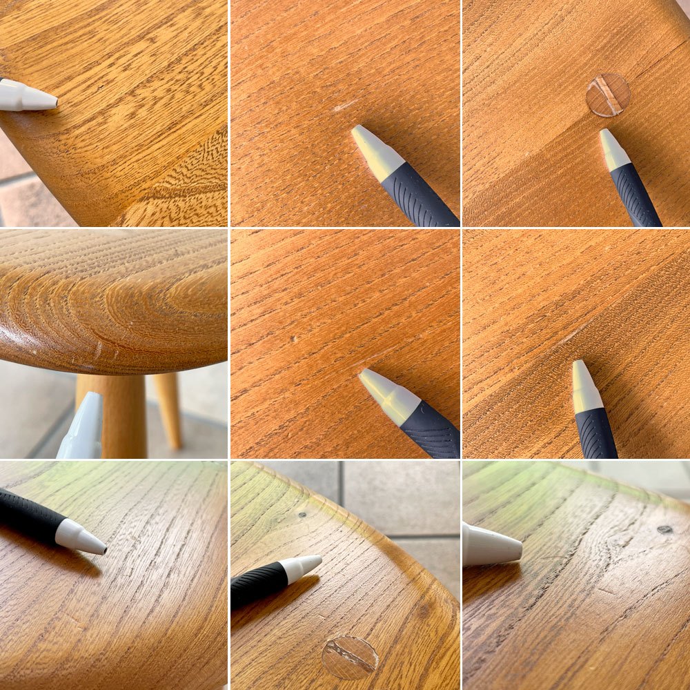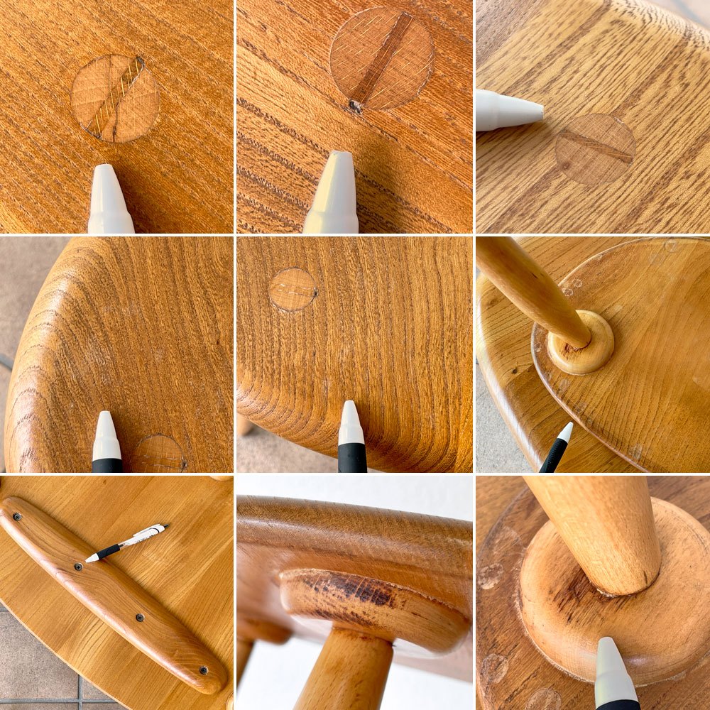 こちらはビンテージ品となります。使用に伴う擦れ傷の他、細かな打痕やうっすらとした線傷、接合部付近における塗装表面の微細な割れや白濁、天板裏や脚部には節目や木部の着色、ワックス痕など年月相応の使用感は見られるもののいずれも大きく目立つものではございません。ほか一番大きなサイズのテーブル裏面の木部パーツのネジはプラスネジに換装されておりますがグラつき等ご使用に問題となるダメージは無く、今後とも雰囲気を楽しみながらお使い頂ける、ビンテージ品として概ね良好なコンディションを保っております。