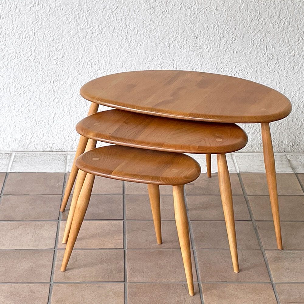 ERCOL PEBBLE 354 Nest of tables イギリスを代表する老舗家具メーカー「ERCOL | アーコール」より、丸みを帯びた可愛らしいフォルムとエルム材の美しい杢目が目...