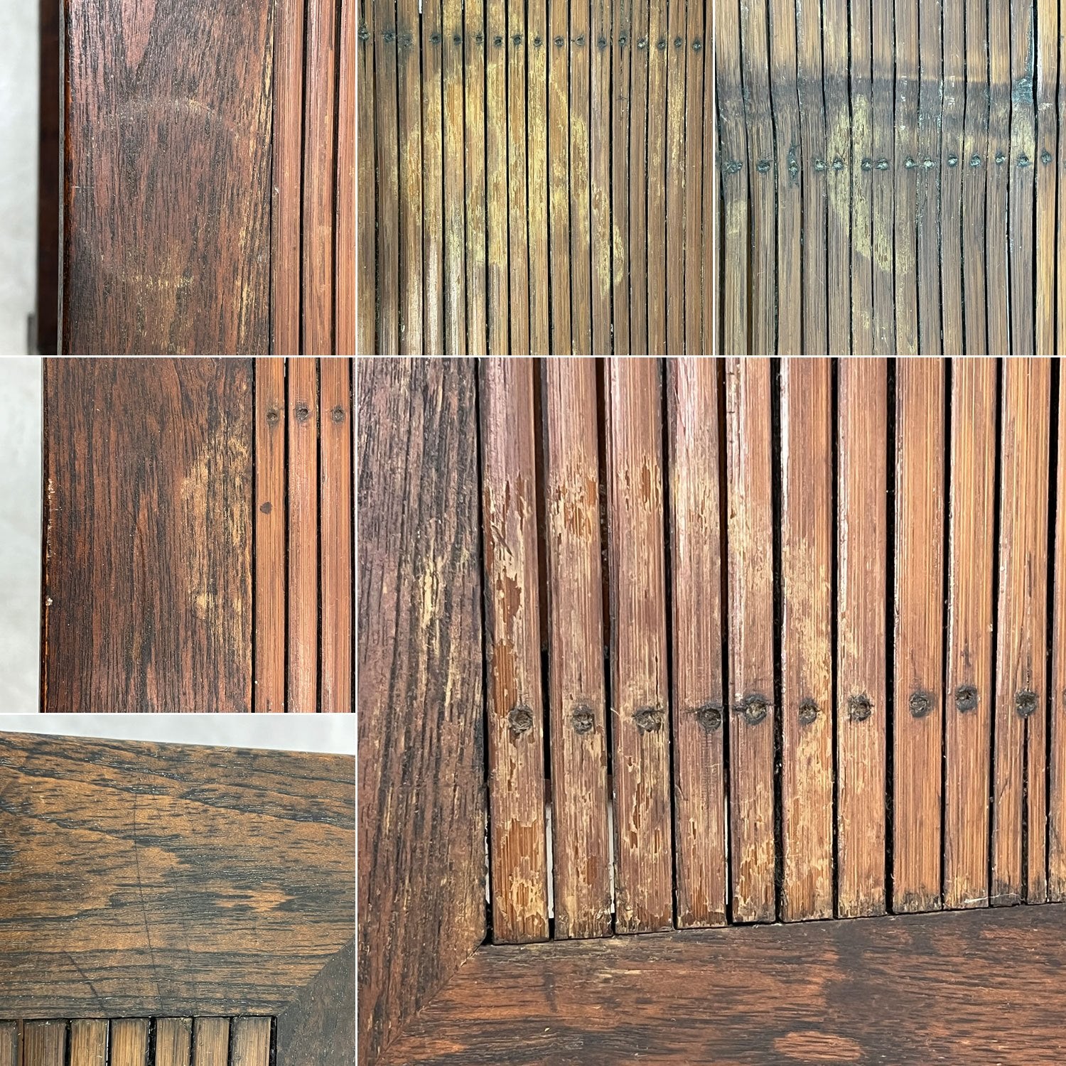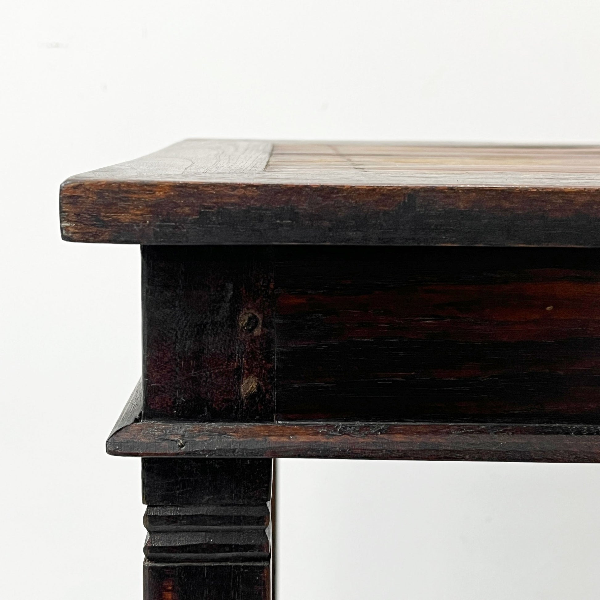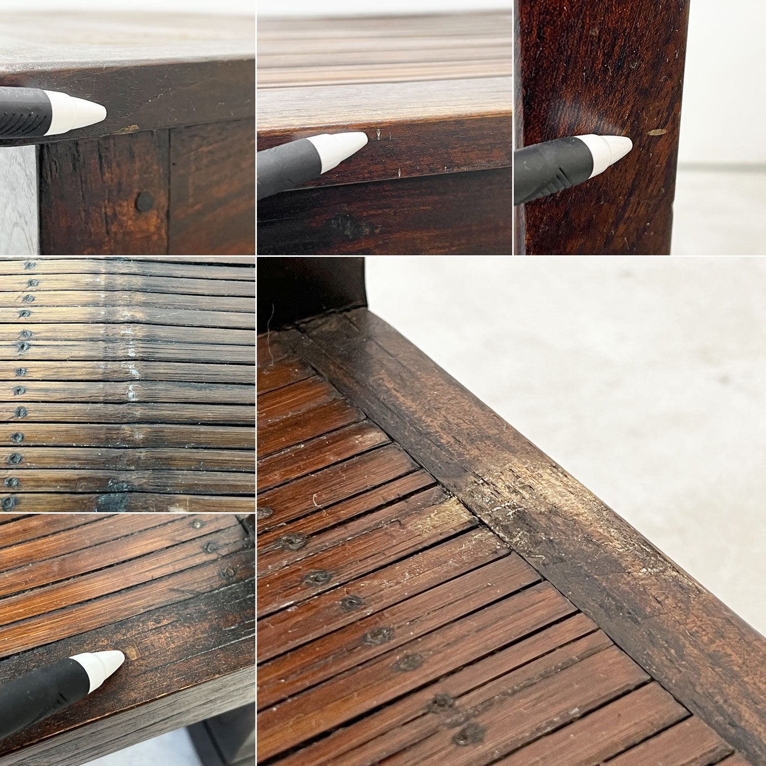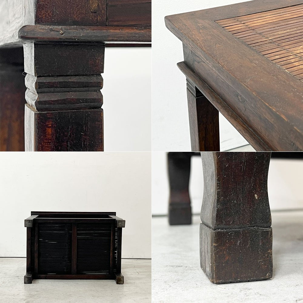 使用に伴い、天板の輪染み、フレーム部分の打痕・線傷があります他、古材を使用しているため色ムラ・黒ずみがございますが、大きく美観を損ねるものではありません。