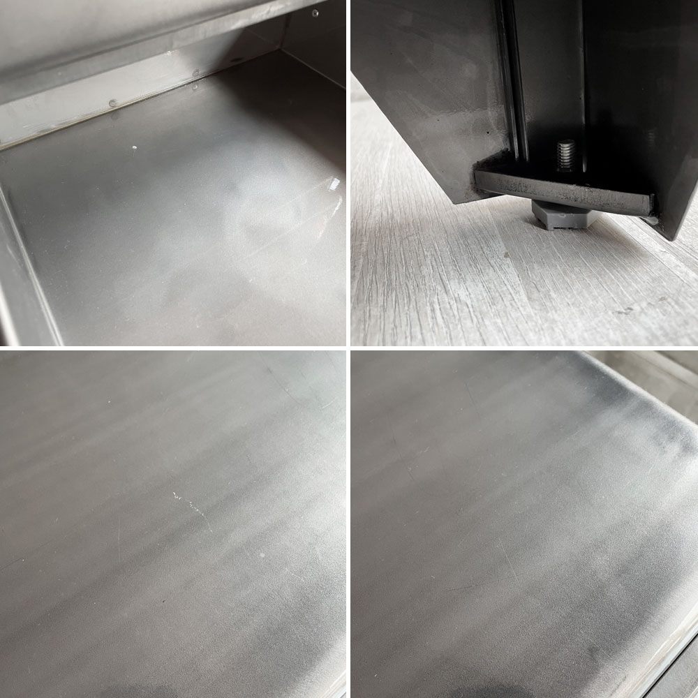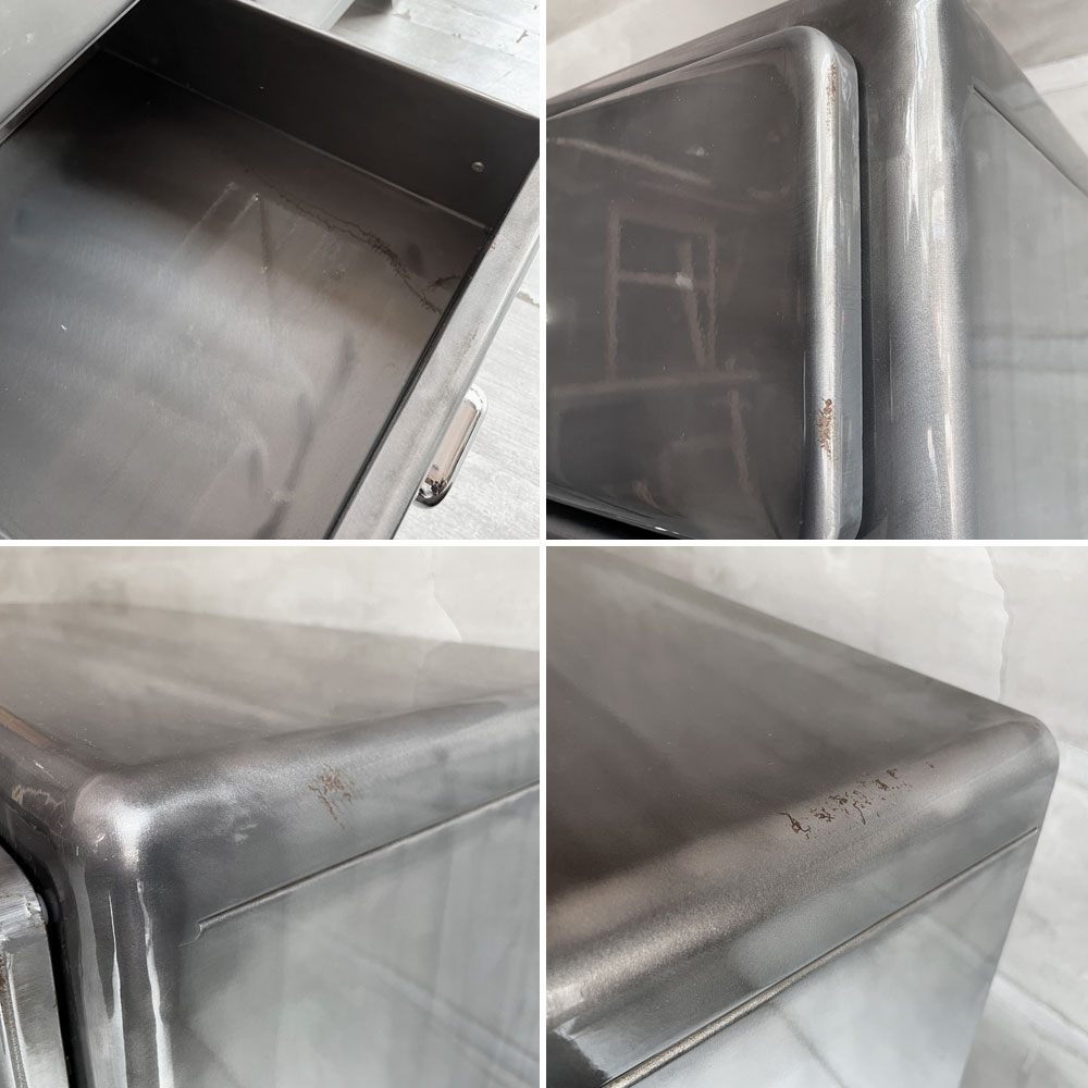 丸く仕上げられたエッジ部分や素地にクリア塗装をあえて施すことで印象を和らげ、溶接痕や研磨跡、サビや擦れなどの金属の無機質な表情を残しつつ、インダストリアルの雰囲気を存分に味わうことのできる佇まいに仕上げられています。