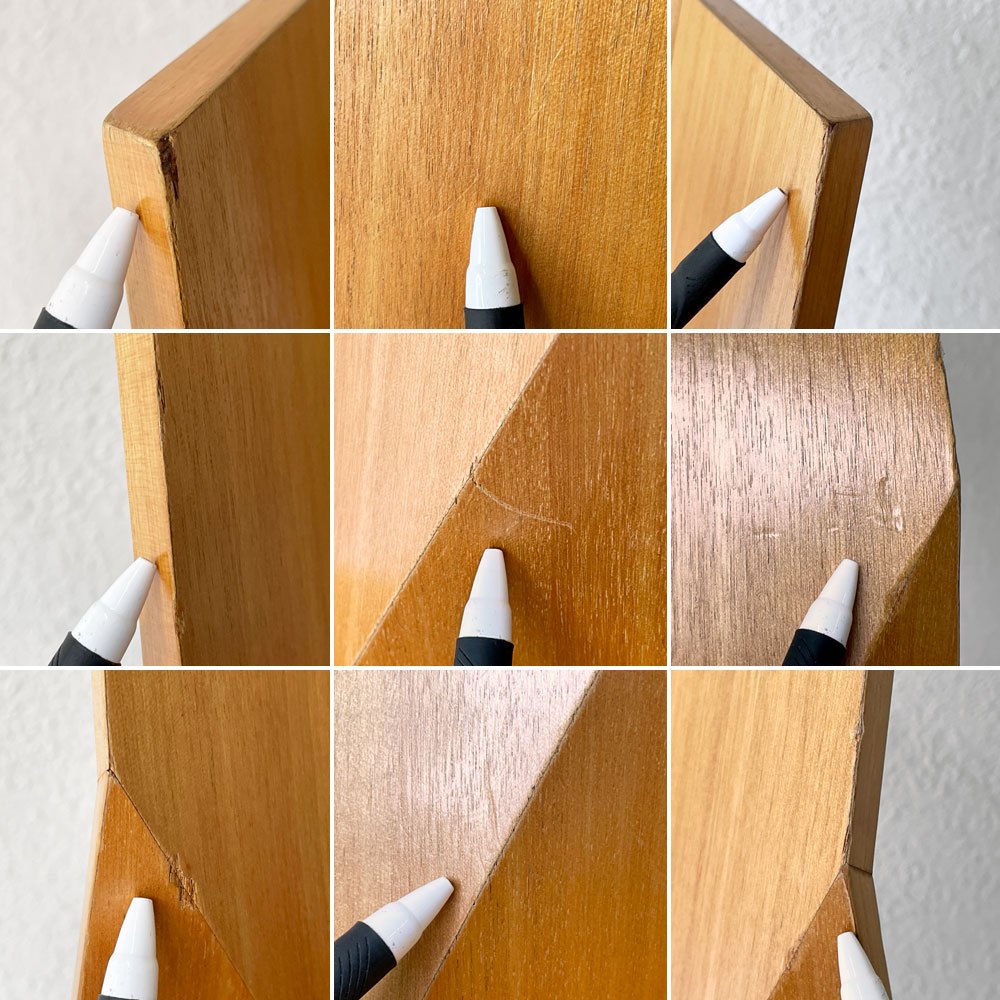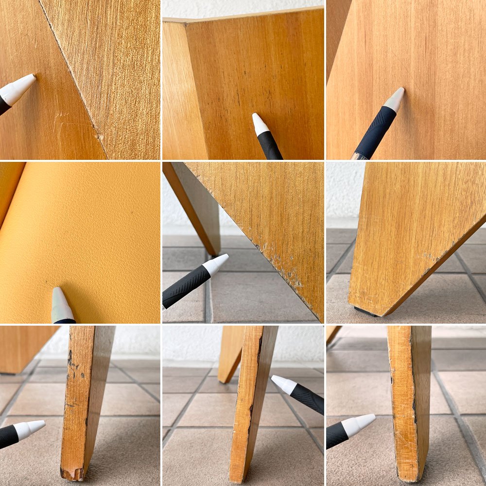 使用に伴う擦れ傷の他、いくらかの打痕や線傷、角を中心とした擦れや突板の剥がれ、わずかな黒ずみや着色とやや使用感が見受けられますが、いずれも大きく風合いを損なうものではございません。グラつき等ご使用に問題となるダメージは無く、今後とも唯一無二の雰囲気を楽しみながら気持ち良くお使い頂けるUSED品として概ね良好なコンディションを保っております。