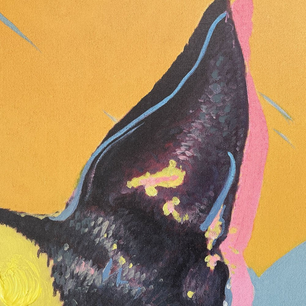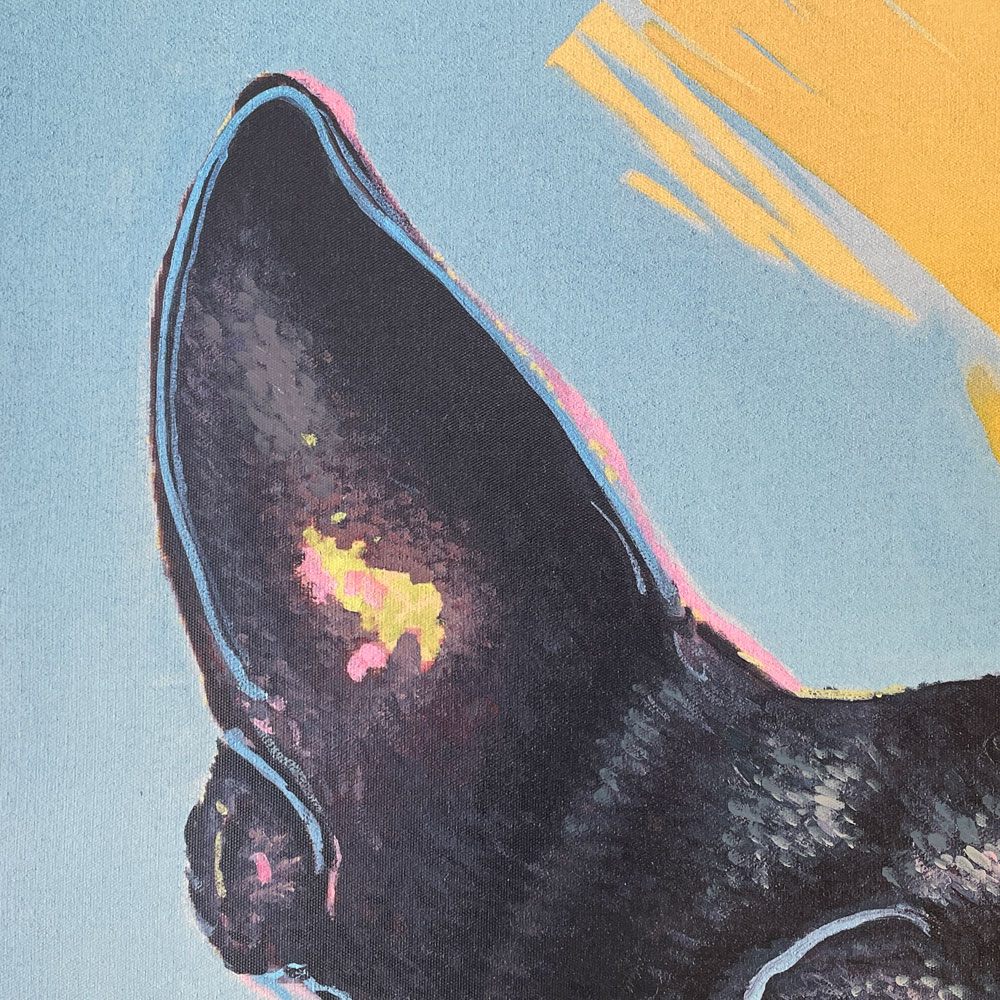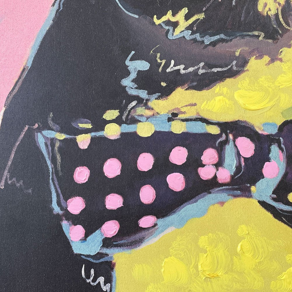 " Picture Touched Monsieur Toto "は、フレンチブルドッグをモチーフにポップな表現で完成された希少廃番の平面作品。絵はリネン、アクリル絵の具。フレームには ポリウレタンとモミ無垢材を材料にしています。
