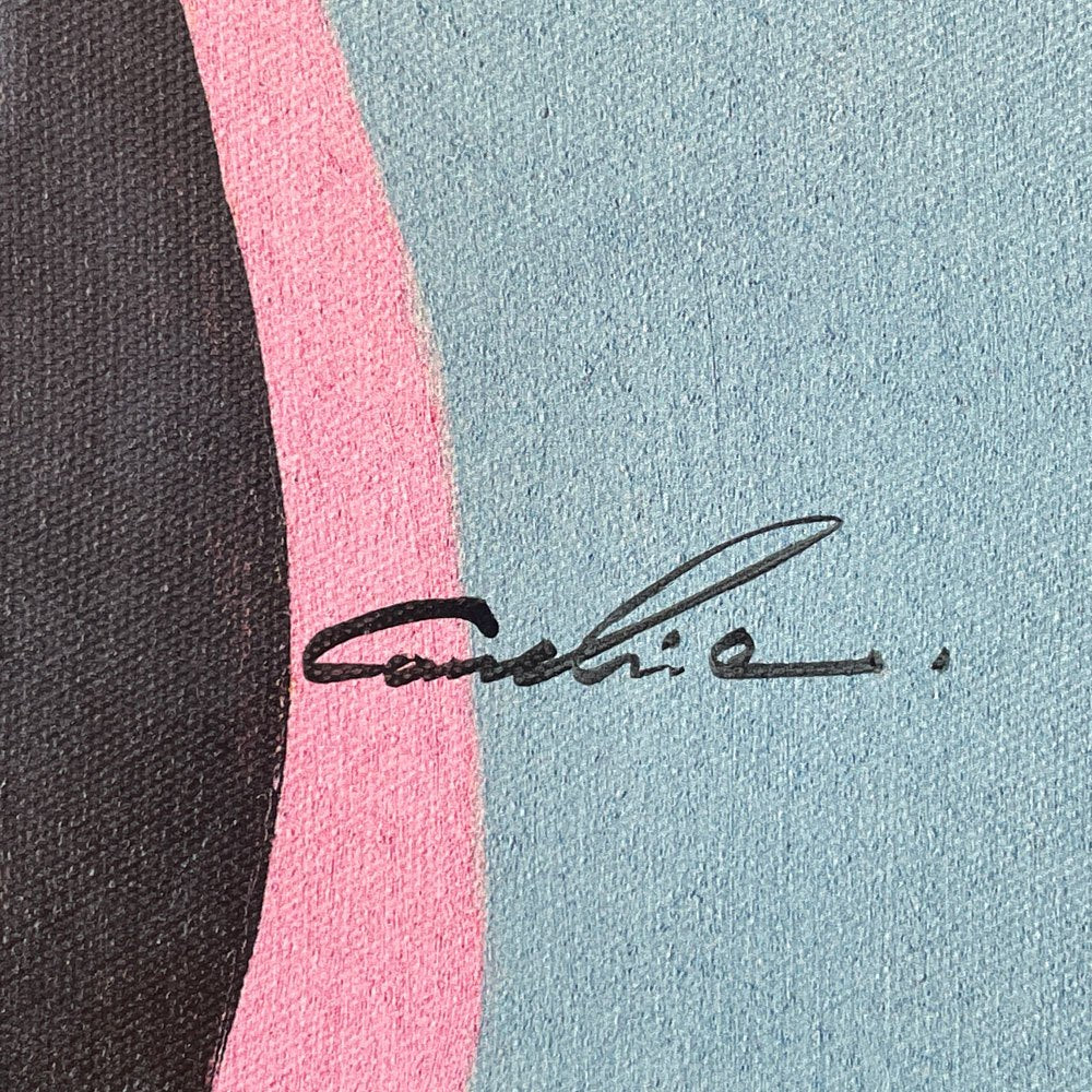 微細な擦れやペイントロスが見られます。また画面中央に木枠の痕の様な薄い線がございますが、製造時のものかは不明です。フレーム裏面に小さな穴やタッカー(ホチキスの芯)に隙間があり、元々カバー等が施されていたものと思われます。紐と金具は純正のものかは不明ですが、問題無く壁掛け可能です。その他、観賞に問題となる大きなダメージはございません。これからも気持ちよくお使い頂けます。