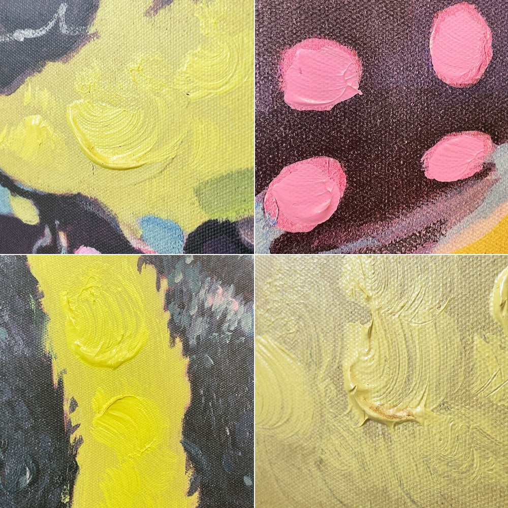 技法の詳細は特定できませんでしたが、おそらくアクリル絵画調にデジタルプリントされたキャンバスに対し、一部ハンドペイントで絵の具を盛り上げ、量産性とリアリティの両立を生み出したもの。具象と抽象を組み合わせた世界観ゆえにチープな印象はなく、空間に個性を加える壁掛けインテリアとして大きな役割を果たしてくれます。