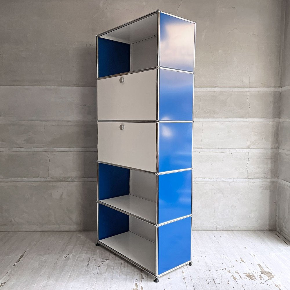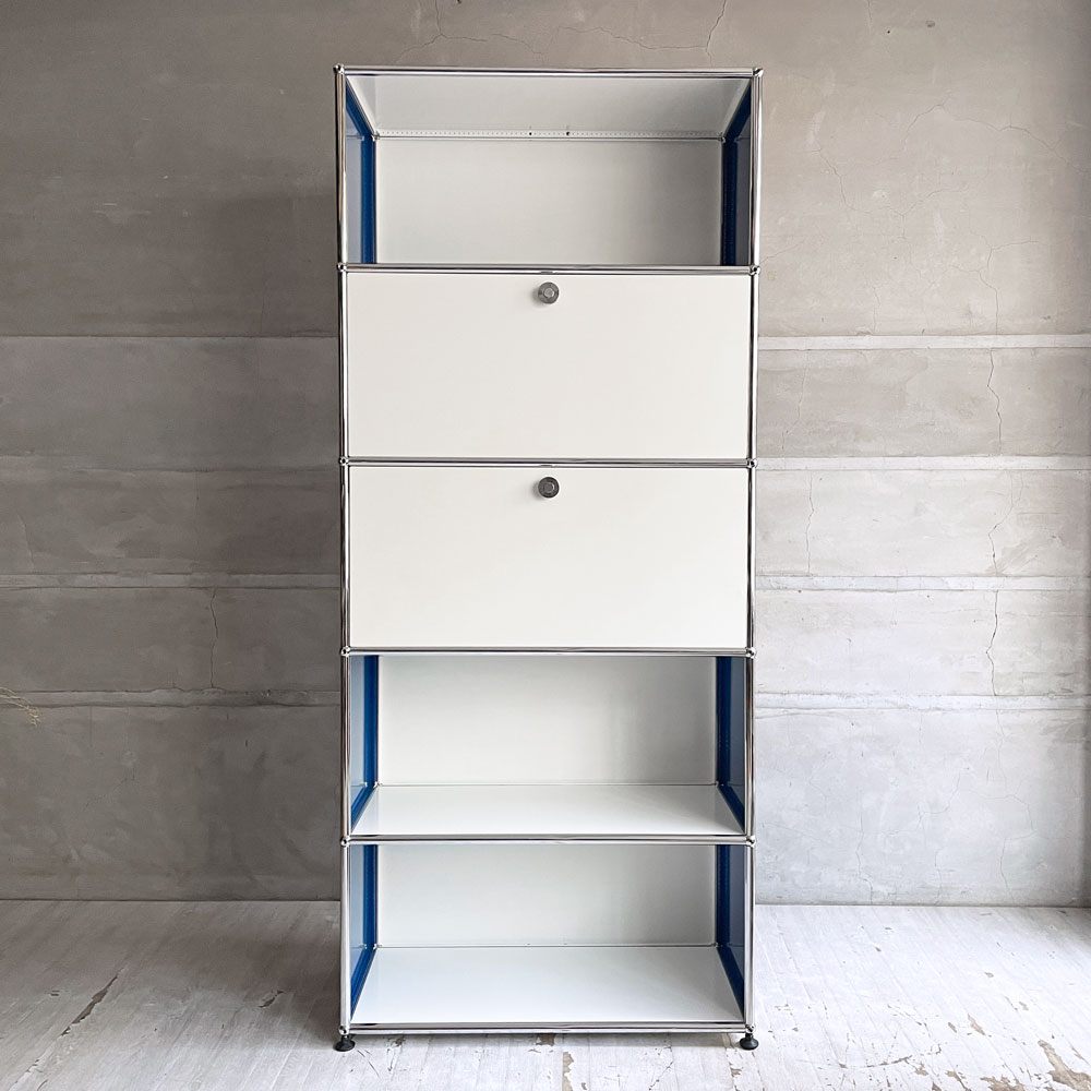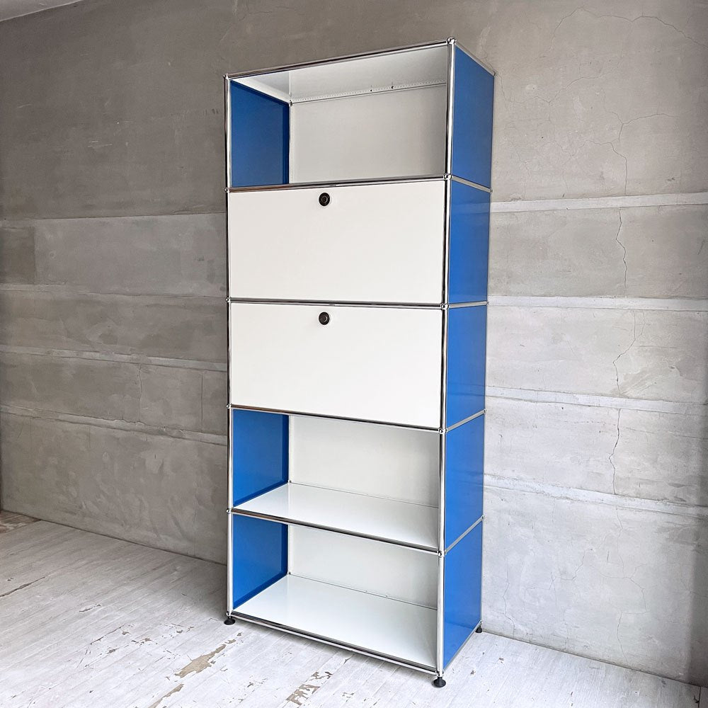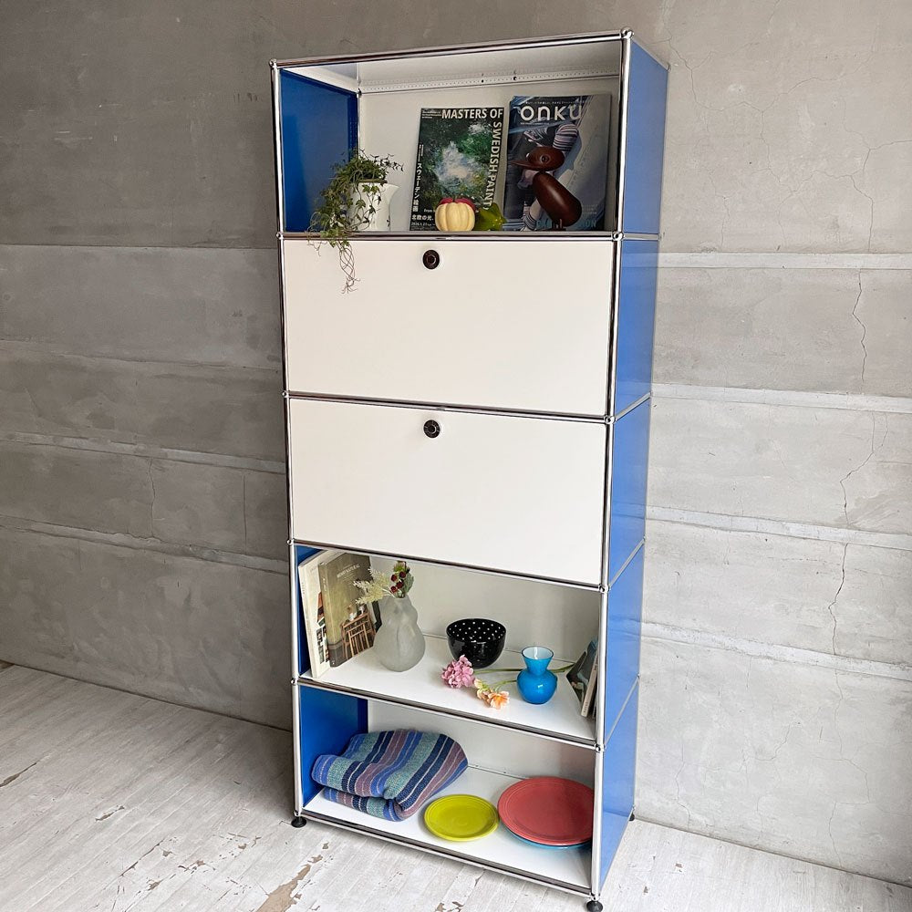 ユーエスエムハラー USM Haller モジュラーファニチャー キャビネット シェルフ 1列5段 ピュアホワイト×ジェンシャンブルー ドロップダウンドア×2 アジャスター付 スイス♪
