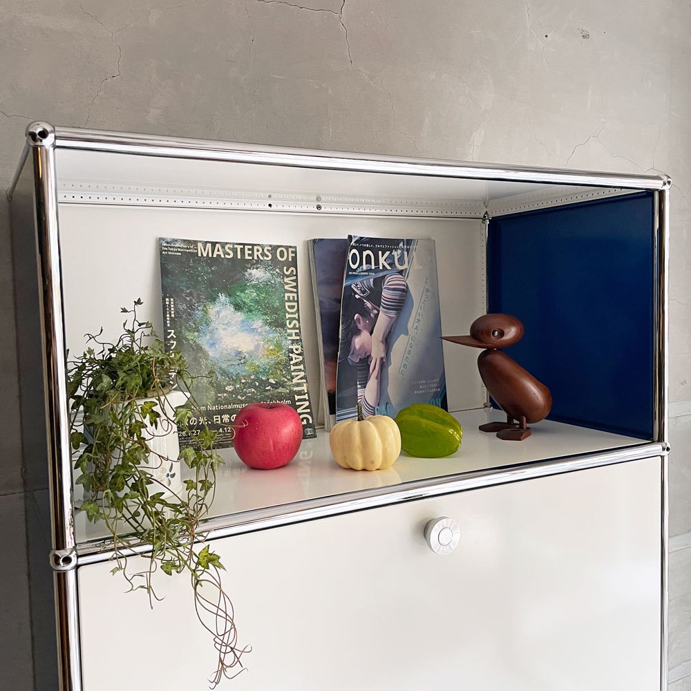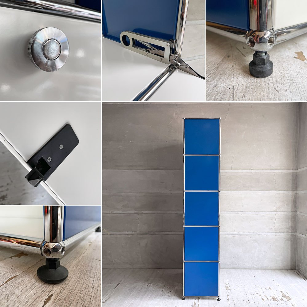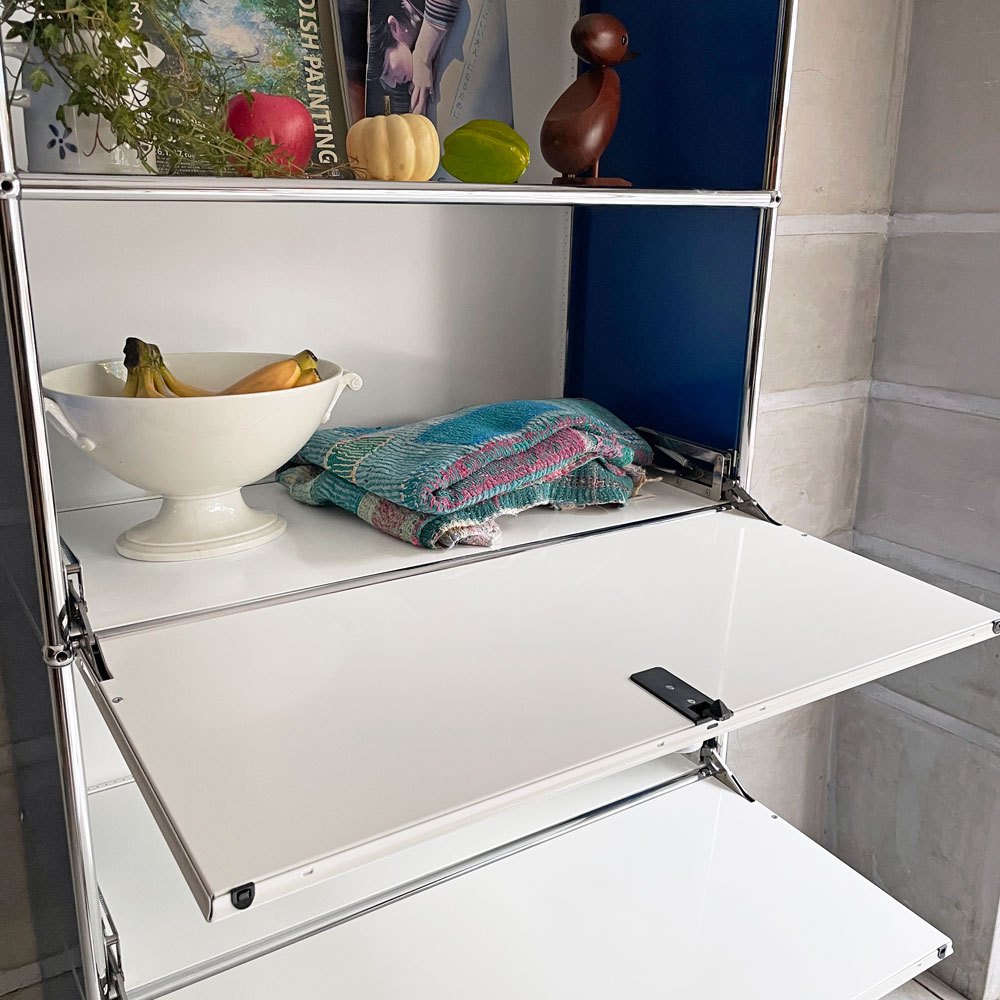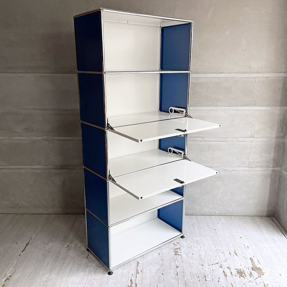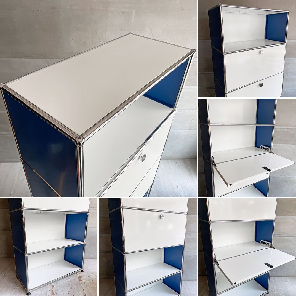 ユーエスエムハラー USM Haller モジュラーファニチャー キャビネット シェルフ 1列5段 ピュアホワイト×ジェンシャンブルー ドロップダウンドア×2 アジャスター付 スイス♪