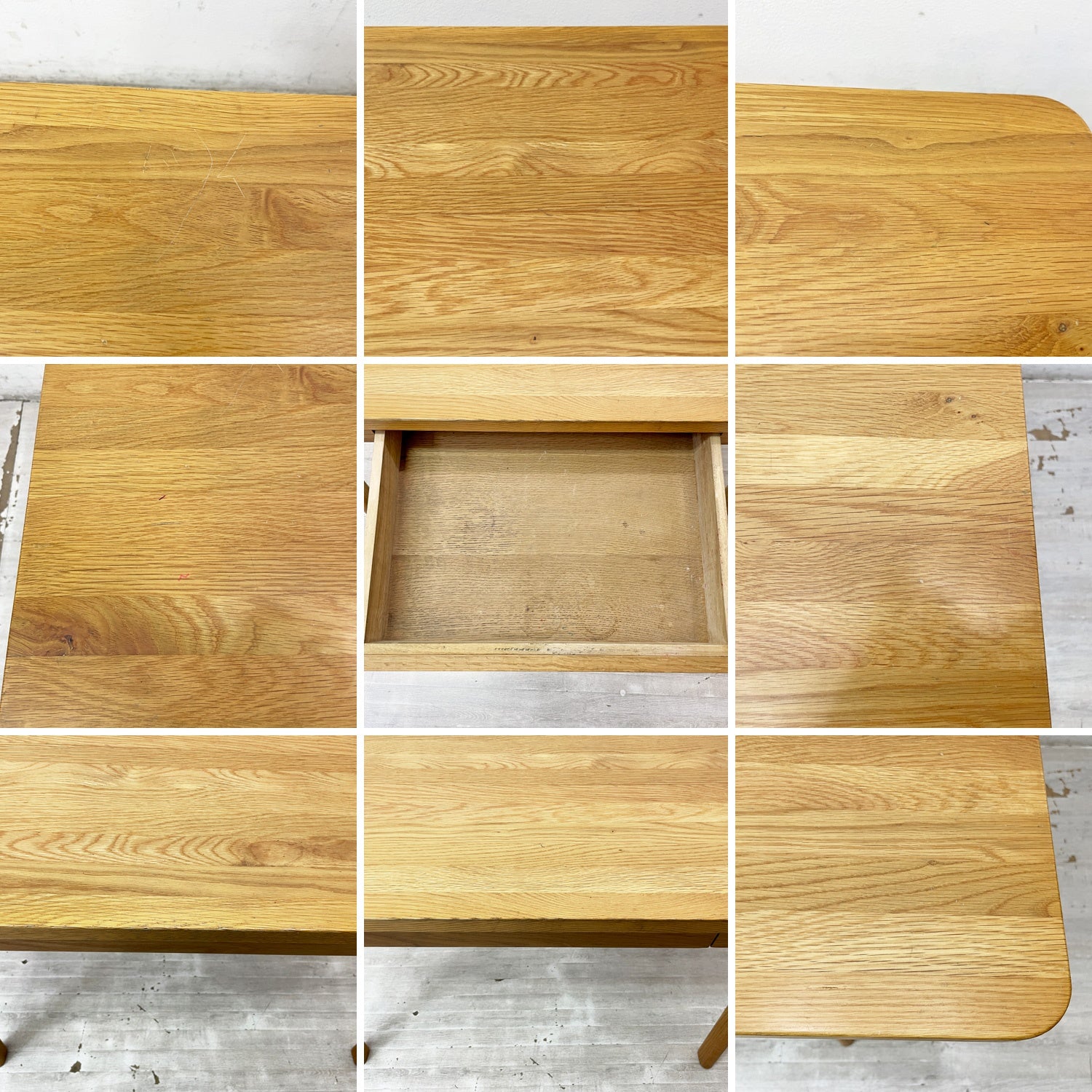 使用に伴い、天板に擦れや線傷や打痕、取りきれない汚れや黒ずみ、抽斗内に黒ずみや染み、打痕や落ち切らない汚れ、脚部に擦れや線傷が見受けられます。