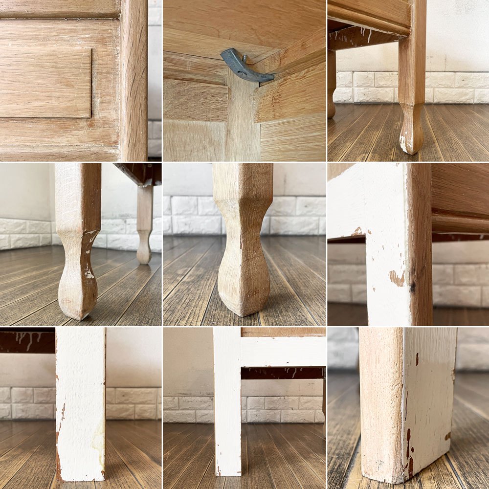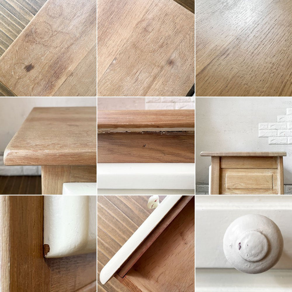 全体にペイントを剥がした痕が見受けられるとともに、使用に伴う擦れや傷、縁の削れ等がございます。また、天板の輪染みや抽斗内部のペン痕、シミ、ペイント部分の黄ばみなどの取り切れない汚れが確認できます。その他、ペイントロスやシールの剥がれといったダメージはございますが、ビンテージのような風合いとしてお楽しみください。がたつきやぐらつきは感じられず、まだまだ実用いただけるコンディションを保っております。
