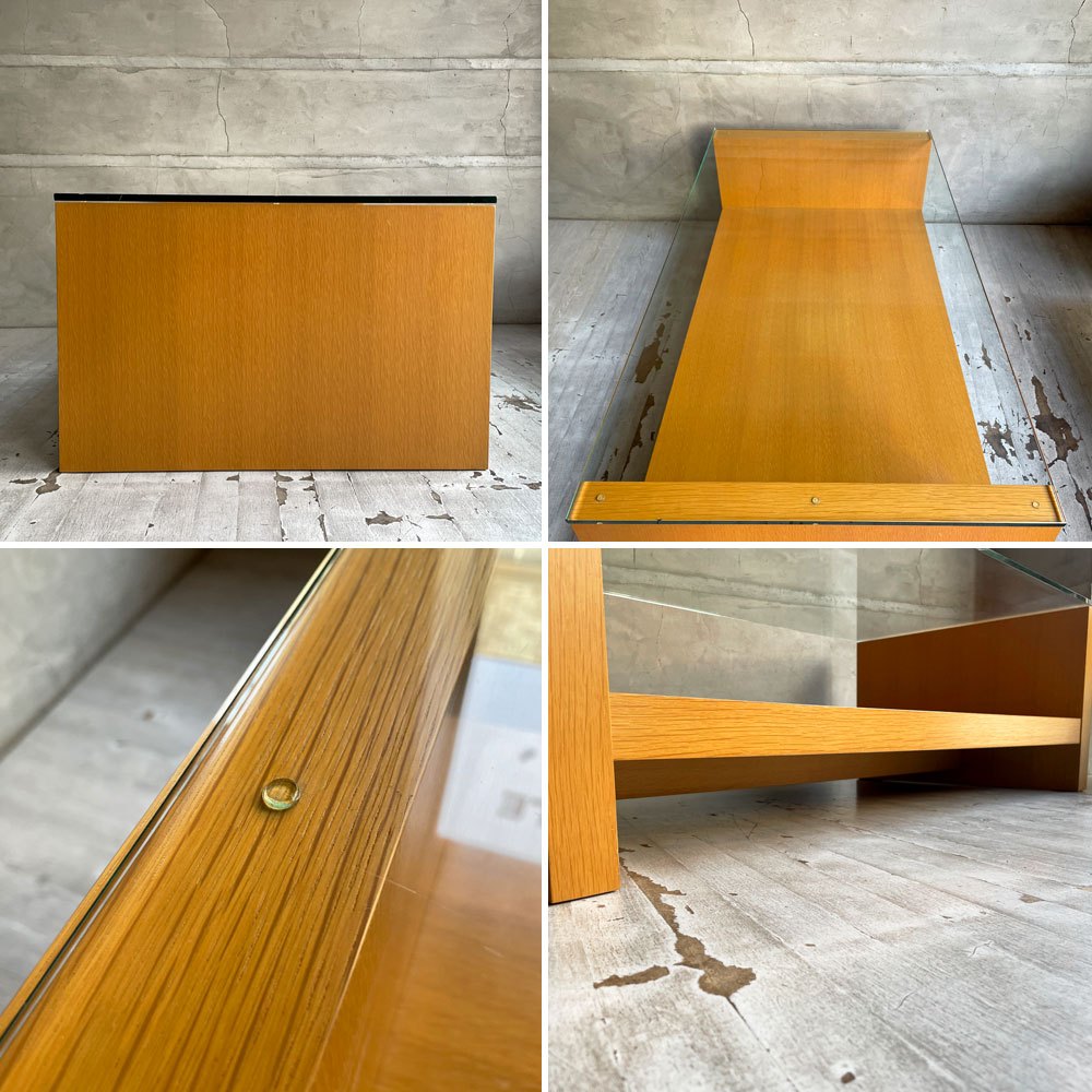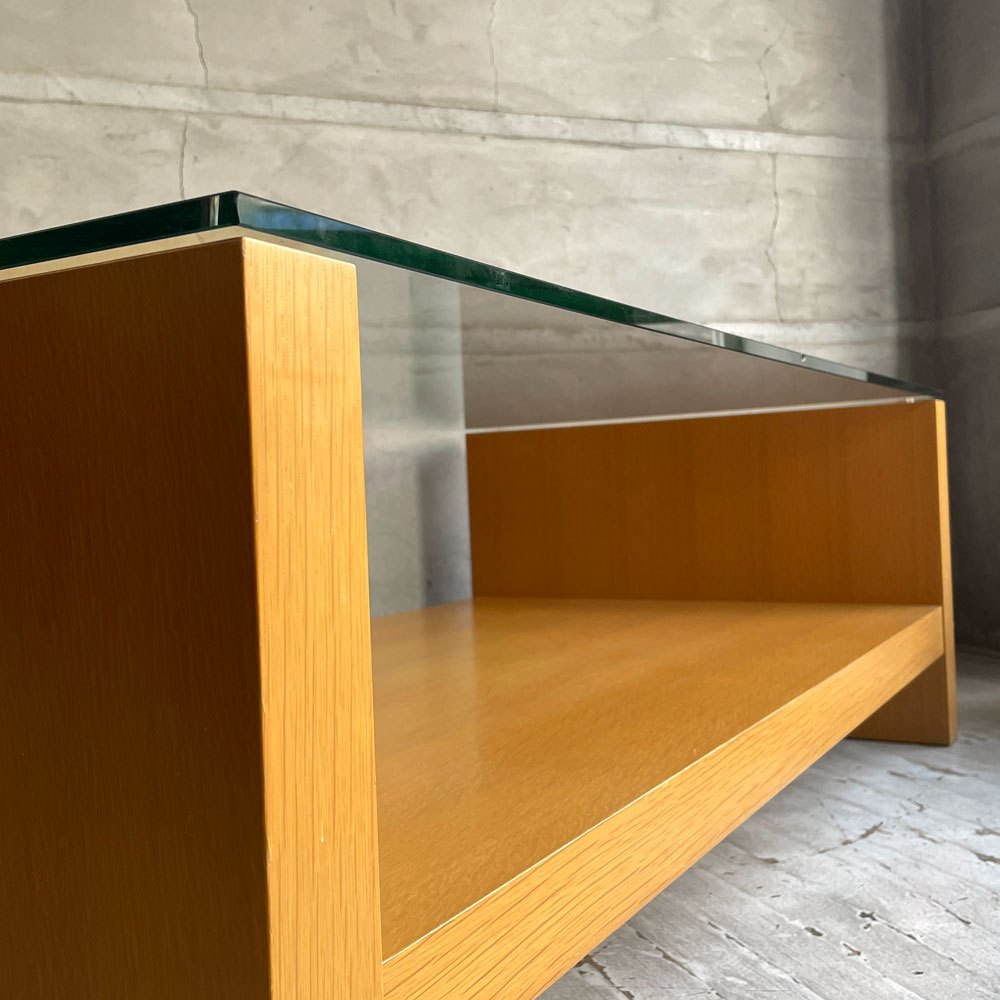 ガラス天板は圧迫感を与えず、すっきりとした佇まいを演出。ガラス越しにウッドフレームの杢目の美しさや収納したアイテムを楽しむ事が出来ます。