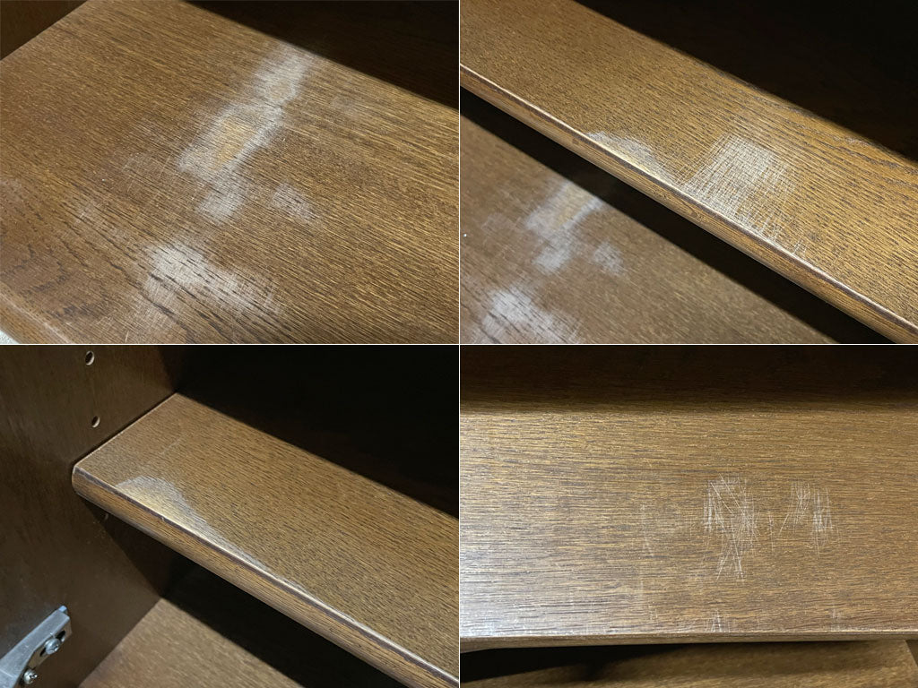 ガラスキャビネット内の棚板のダメージはさほど目立つ箇所にはございません。