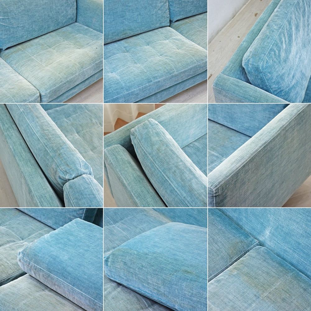 使用に伴い、全体に複数の染みと汚れ、擦れによる色抜け、毛羽立ち、座面中央にへたりなどの使用感が見受けられます。