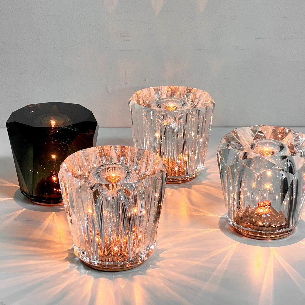 同作を手掛けたのはプロダクトデザイナーの小関隆一氏。「クリスタルガラスの塊の中に、光を閉じ込める」というコンセプトのもと、熟練職人の手によりカットされたガラスが光を屈折させ、幻想的な雰囲気を演出してくれます。