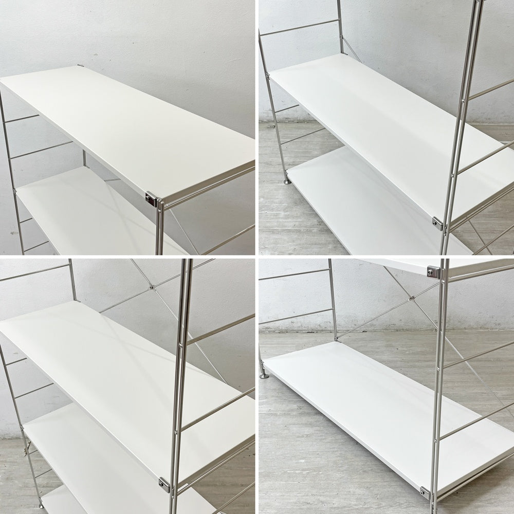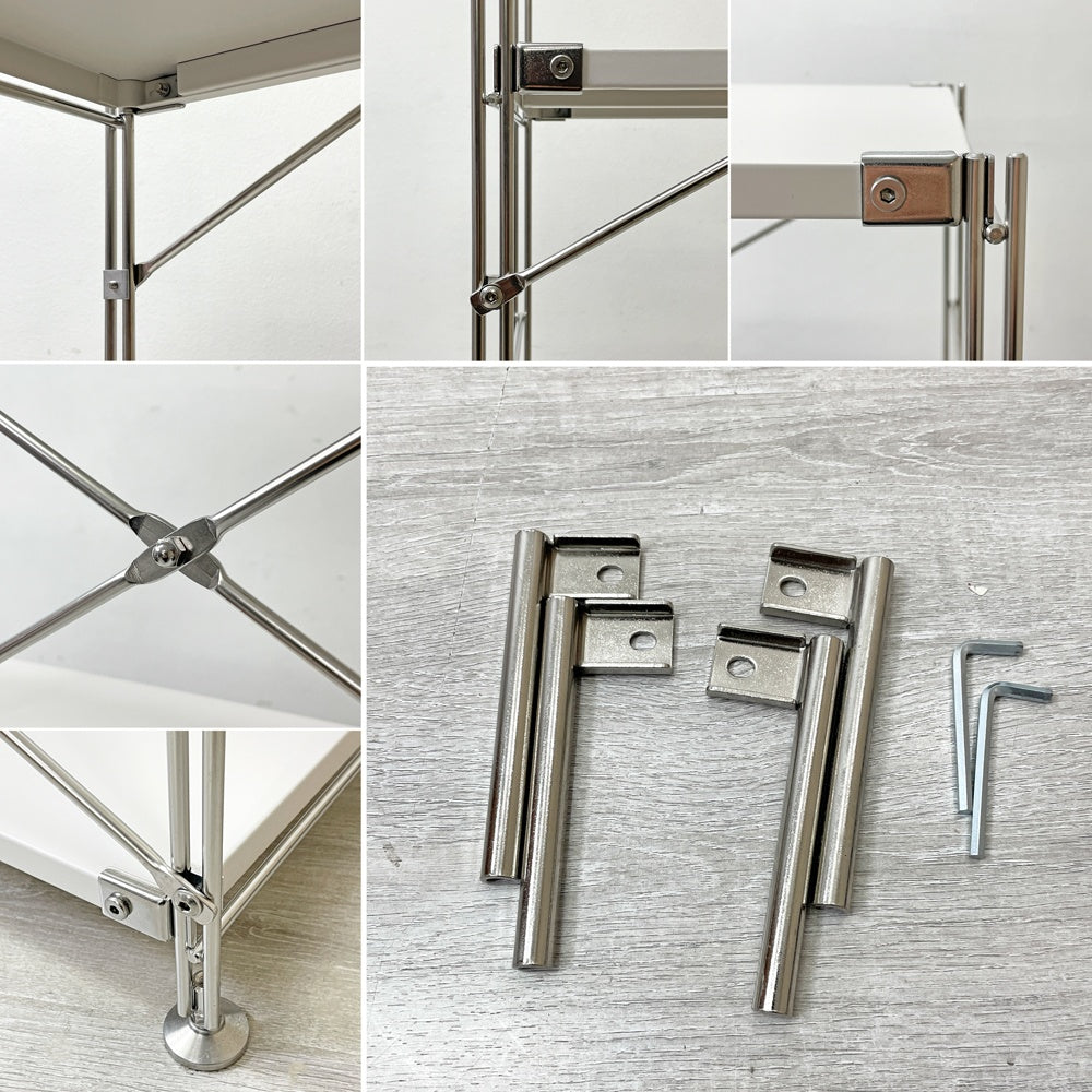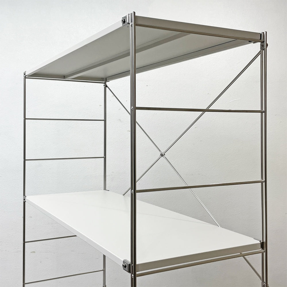 シンプルで使い勝手の良い組合せ式のスチールユニットシェルフは、棚の高さは自由に調整する事が出来る為、収納物に合わせてお使い頂く事が可能。