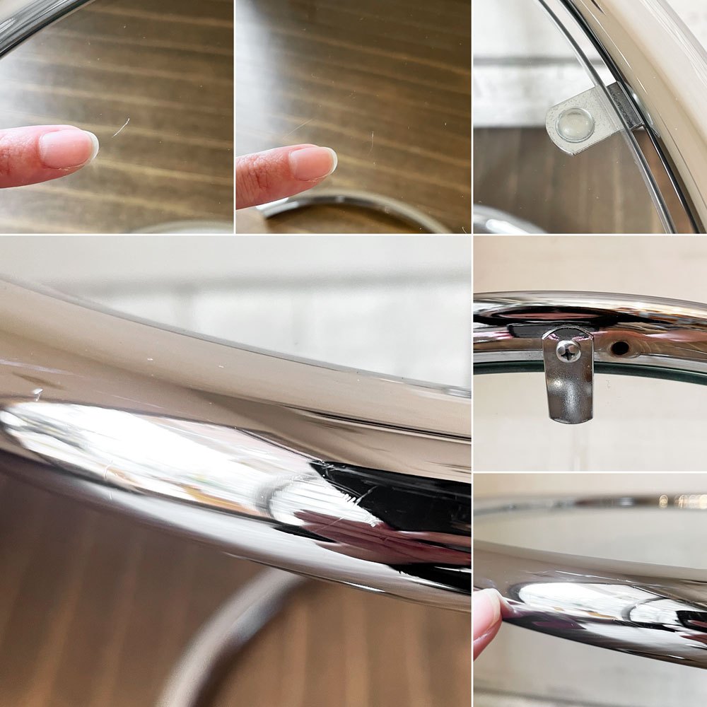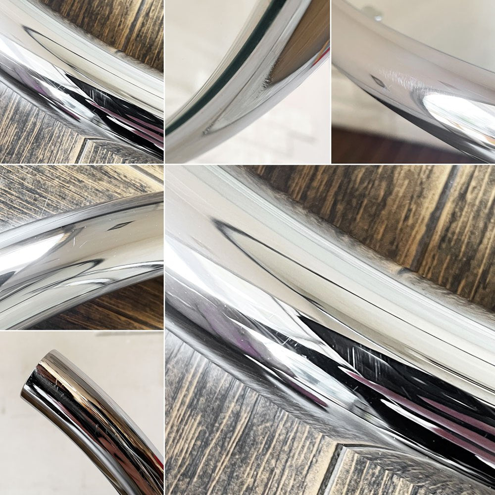 使用に伴う、擦れや小傷等がガラス・フレームともに見受けられますが、いずれも著しく美観を損ねるダメージではございません。なお、ガラス天板の受けを取り付ける場所が付け替えられており、天板フレームの裏側に穴が1箇所あいています。その他金属部分のくすみや取り切れない汚れはあるものの、今後も安心して実用いただけるコンディションを保っております。