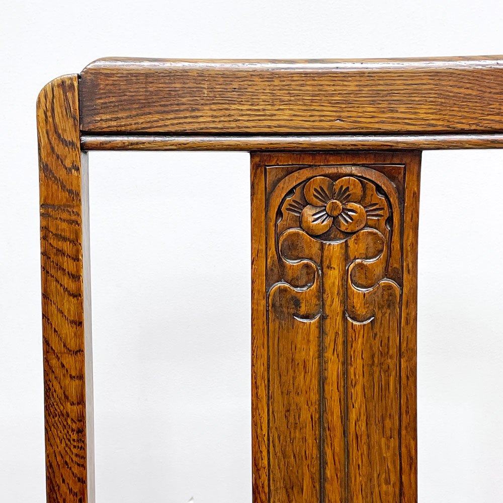 ダークな落ち着きを見せるオーク製フレーム、バックレストにはボタニカルのモチーフによる木彫が施され、脚部は英国家具で特に人気となっているバルボスレッグ仕様。華やかで重厚感溢れる佇まいが魅力です。