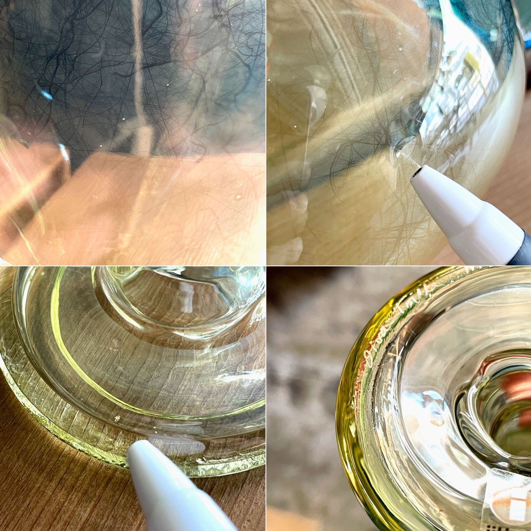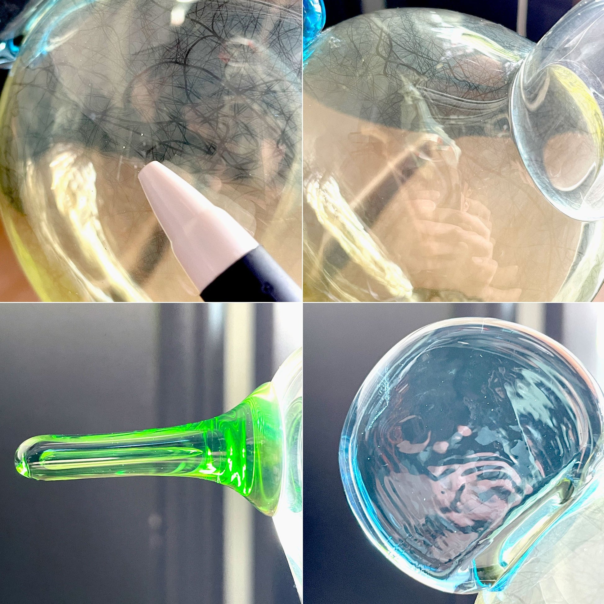 展示・保管に伴う極軽微な擦れや、製造時に出来たと思われるガラスの揺らぎや凹み、気泡、黒点等がございますが、いずれも手作りガラス特有の風合いとしてお楽しみくださいませ。また、内側には、埃や静電気などで付いたと思われる線状痕が光りの角度によって肉眼で確認できます。 その他、大きく目立つダメージは無く、今後もオブジェとして十分にお楽しみ頂けるコンディションを保っております。