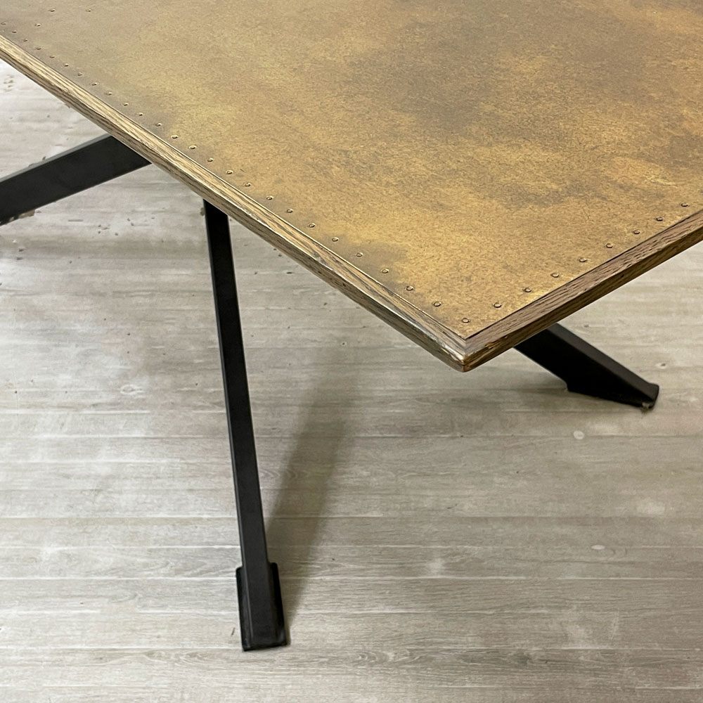 真鍮天板はエッジに鋲打ちが施され、更に力強い杢目を持つオーク材で天板を囲っています。