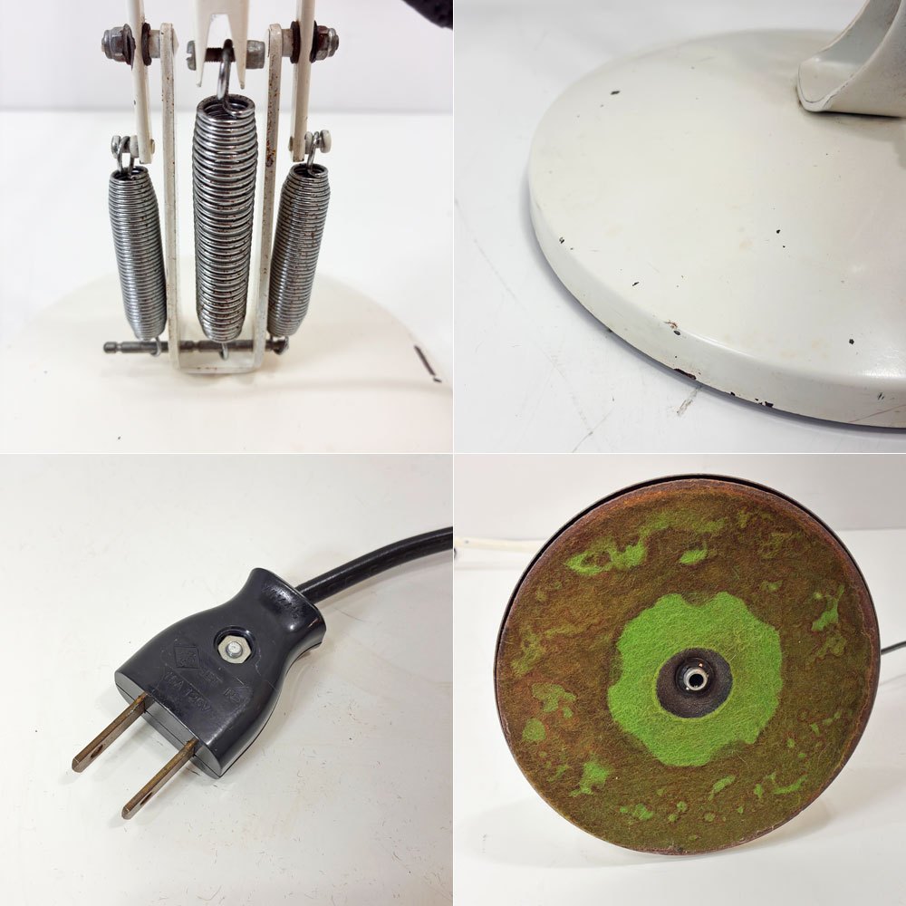 シェードはアルミ製、フレームはスチール製で構成され、ベースは確りとした重量により安定感があります。同社の現行品の様なシェードの上下左右の可動域はないものの、上下の角度調整は可能。またシェードの頂点にあるプッシュ式スイッチで点灯し、カチッという独特の音が、アナログ好きのビンテージファンの心を擽ります。