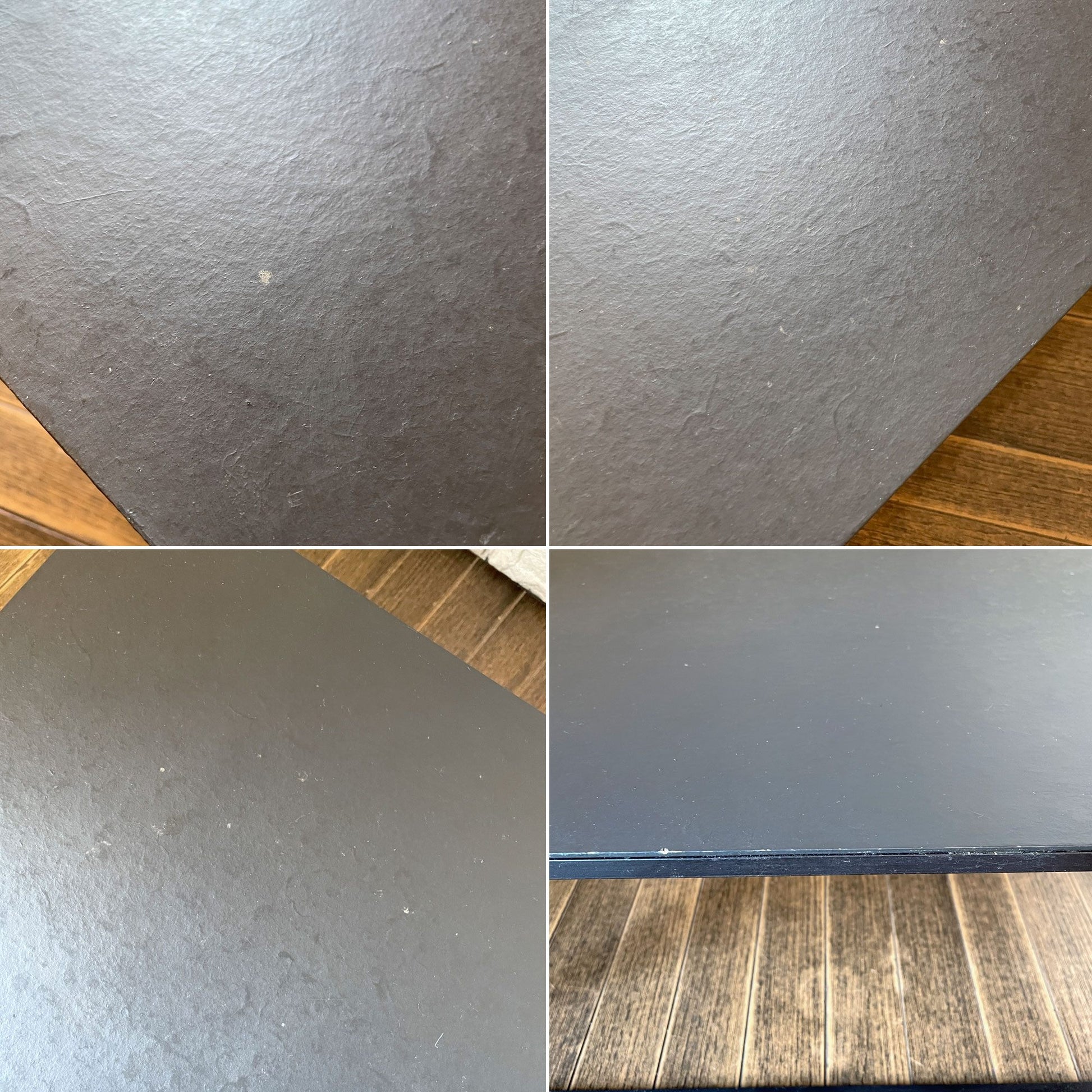 天板には和紙のシミ汚れや毛羽立ち、縁や角の削れや僅かな破れ等が確認できます。また、フレームにはペイント汚れやくすみ、錆等が見受けられるとともに、脚部との接合部にボンド痕が確認できます。その他、使用に伴う擦れや傷などは見受けられるもののいずれも風合いとしてお楽しみいただけます。これからも安心して実用いただけるコンディションを保っております。なお、和紙部分は優しく水拭きにてお手入れいただけます。