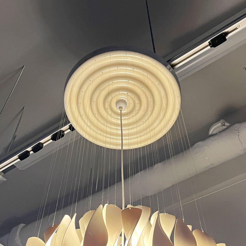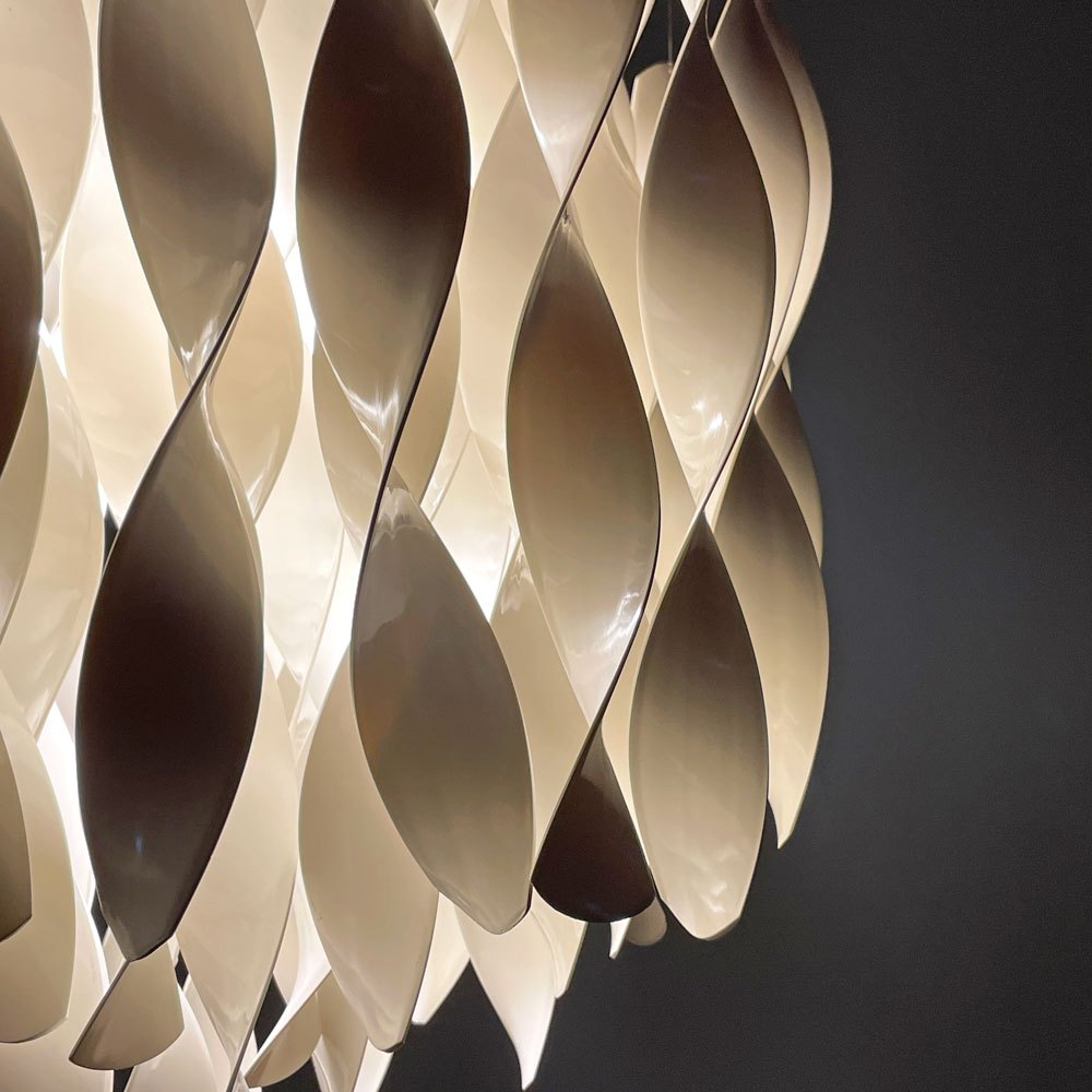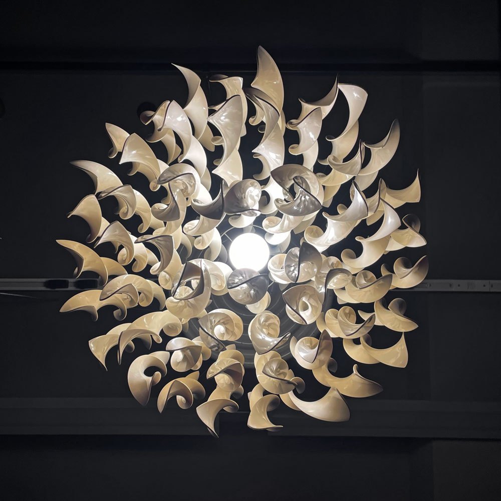 螺旋状にねじられたプラスチック板が無数のナイロンストリングで吊られ、煌めくシェードを形成。