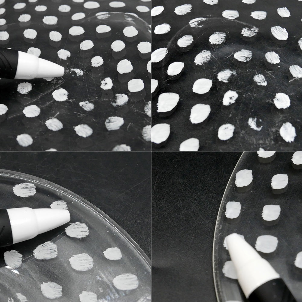 サンドペーパーで表面に擦り傷が入っている作風も特徴です。