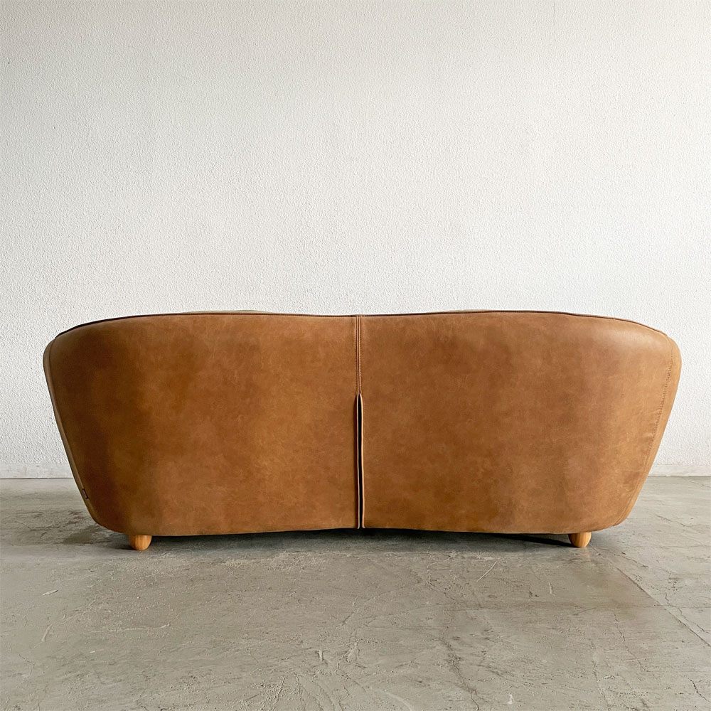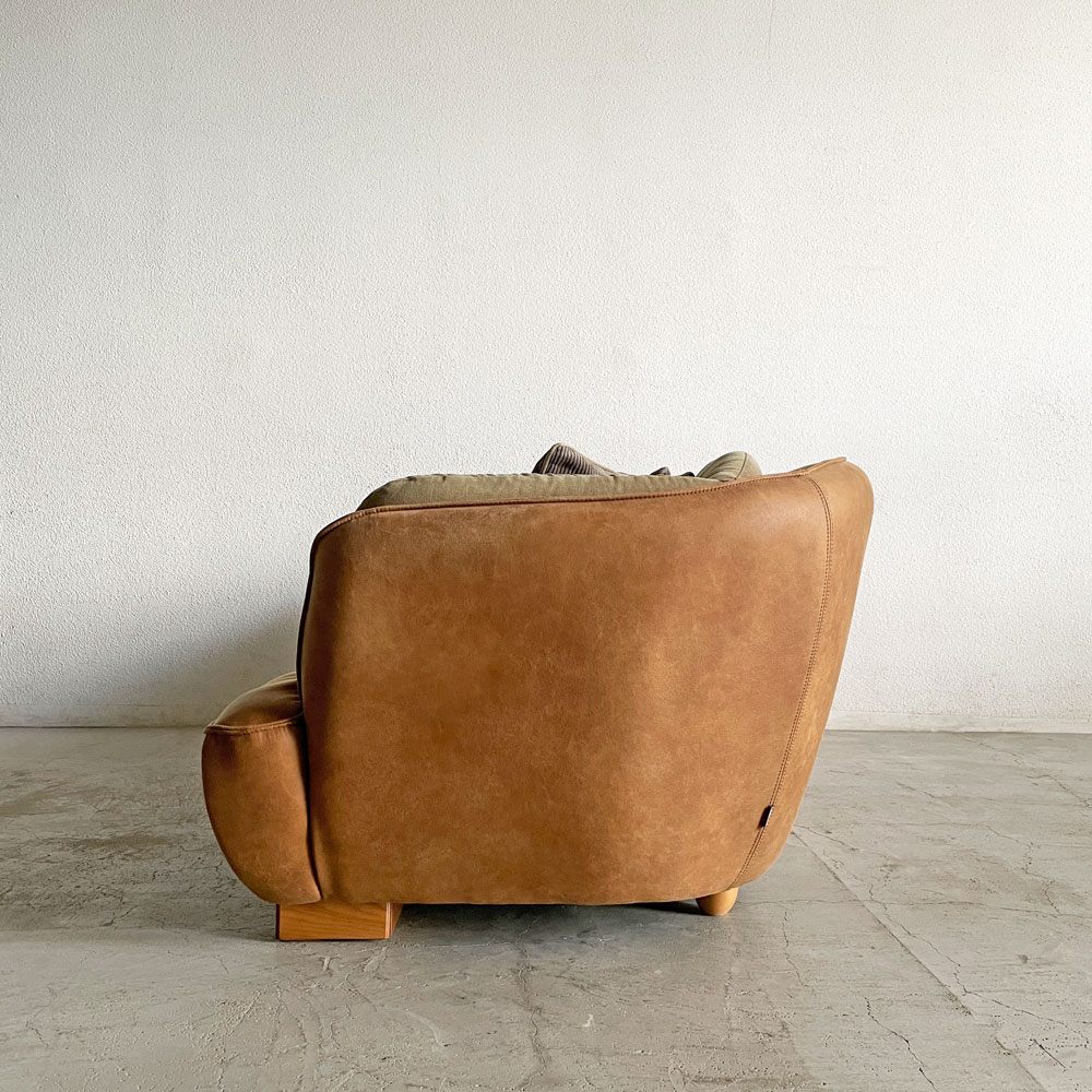 コロンとした丸みのある背もたれのフォルムが特徴的な1台。複雑なフレーム構造をもつため、職人の手作業により丁寧に張り込みがなされるなど随所にこだわりが詰まっています。