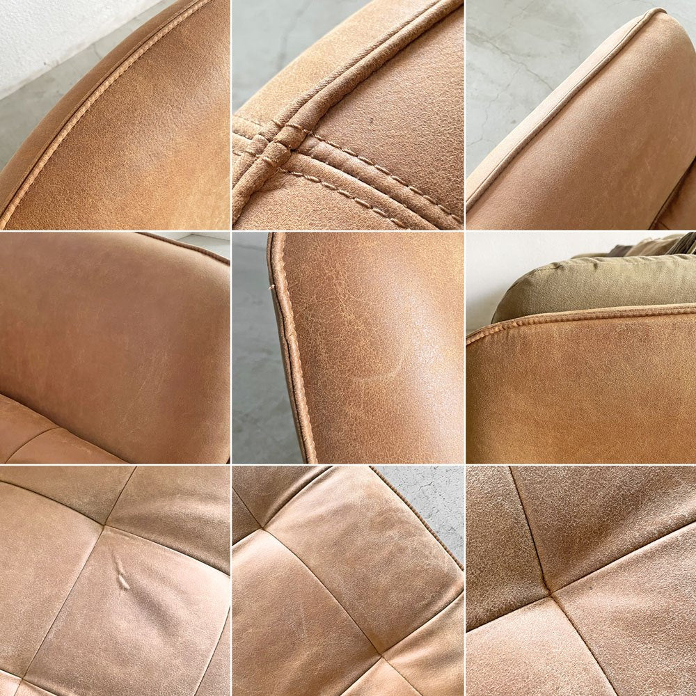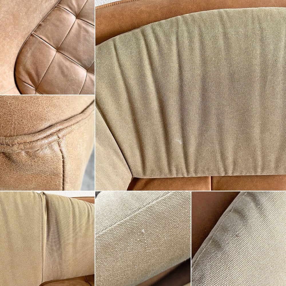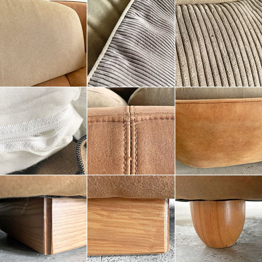 背もたれクッションのキャンバス地カバーには全体にヤケによる色褪せが生じています。また、付属のコーデュロイクッションには異なる2種類のヌード(内部クッション)が使用されていますが、感じられますもともとの仕様かは分かりかねるとともに、いずれもややへたりが感じられます。レザーテックスには擦れ傷や毛羽立ち、黒ずみ汚れが見受けられますが、本革のような味わいとしてお楽しみいただける程度です。その他、布部分のシミ、木製脚の擦れや傷、打痕が確認できますが、ご使用に問題となるがたつきやぐらつきといったダメージはございません。若干の使用感はあるものの、これからも安心して実用いただけるコンディションを保っております。