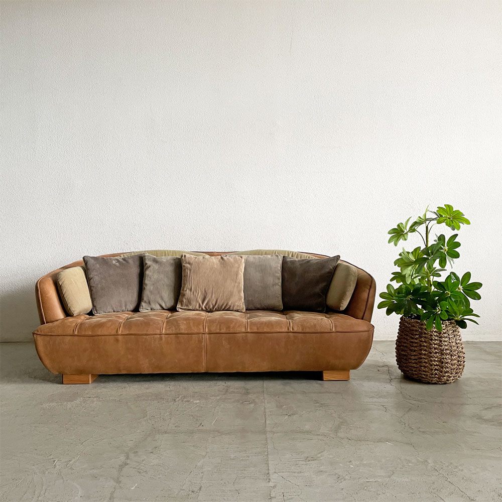 個性的な形状と異素材ミックスにビンテージ感が漂うオピアムソファ。アースカラーによる落ち着いた雰囲気が、さまざまなお部屋にすんなりと溶け込んでくれます。