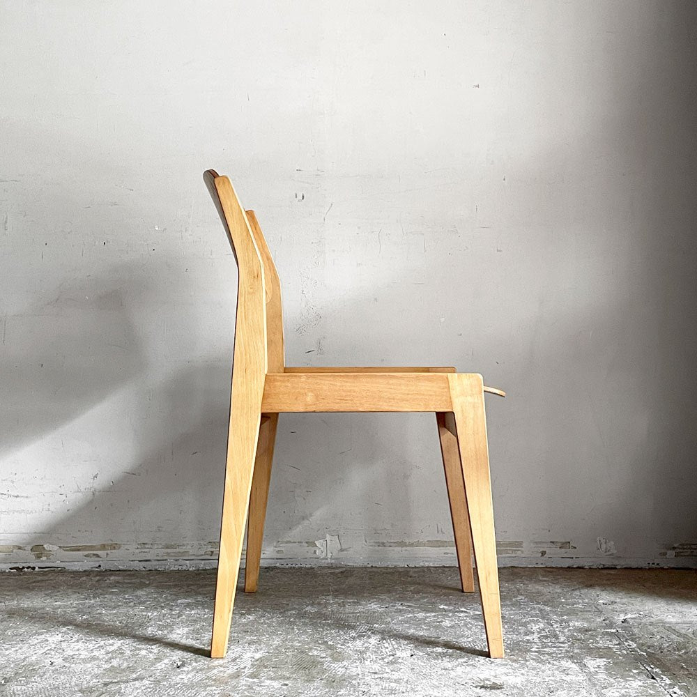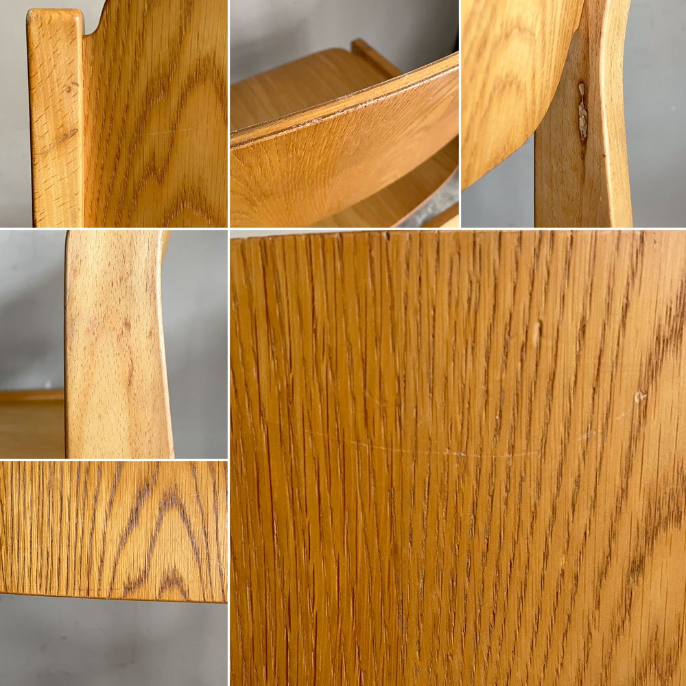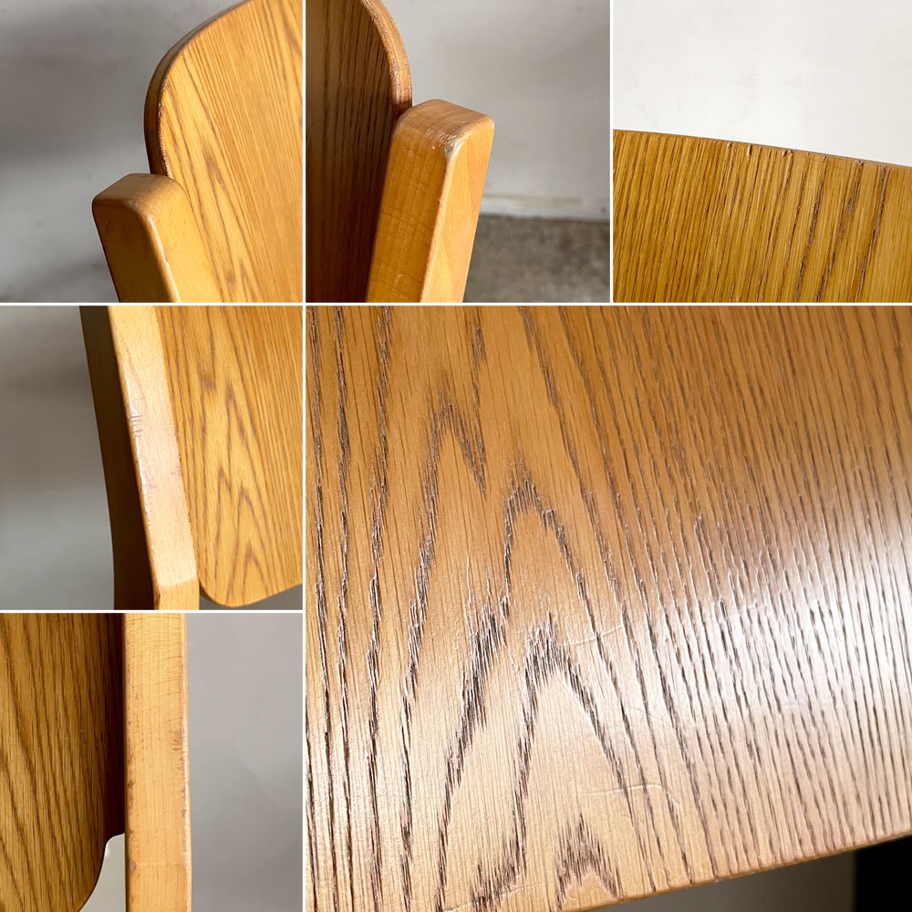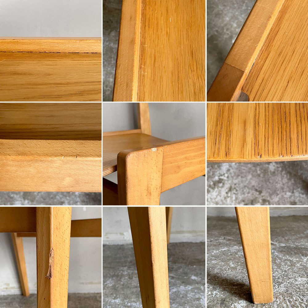 こちらはビンテージのお品物です。使用に伴う擦れや打痕、傷、前脚の一部に目立つ欠けが見受けられます。また、着座時に座面プライウッドの接合方法に軋みが感じられますが、通常のご使用に於いてはさほど気にならないかと思われます。その他、がたつきやぐらつきなど使用に問題となるダメージは無く、これからも実用頂けるコンディションを保っております。