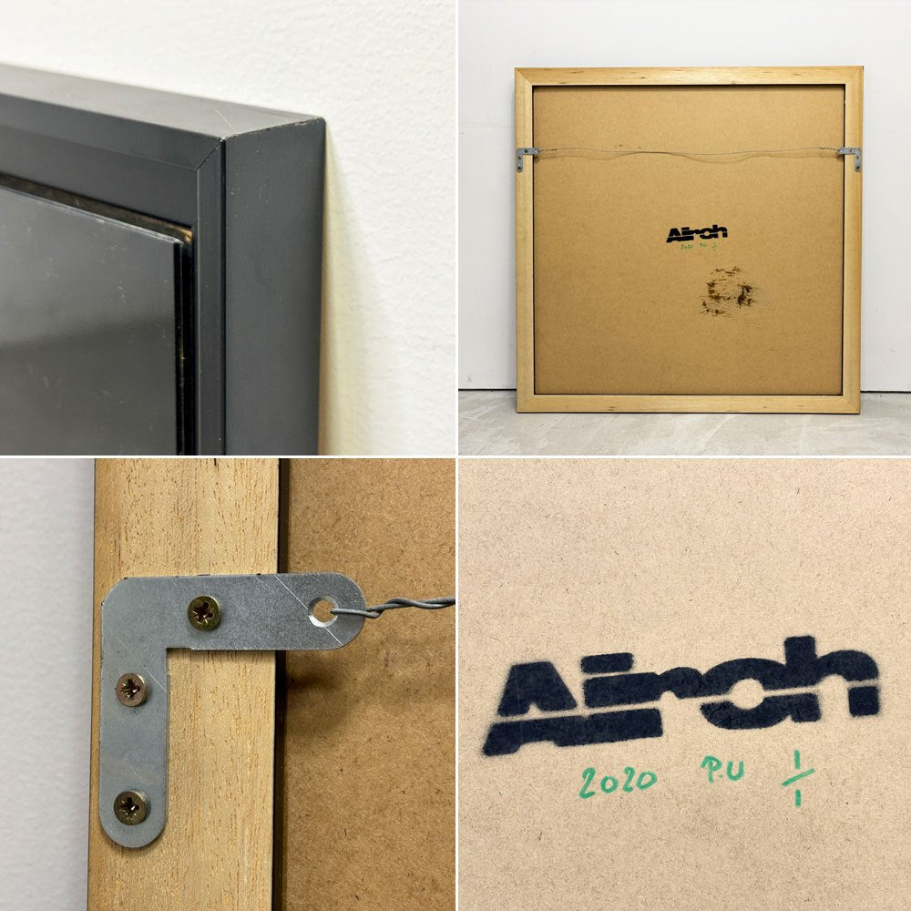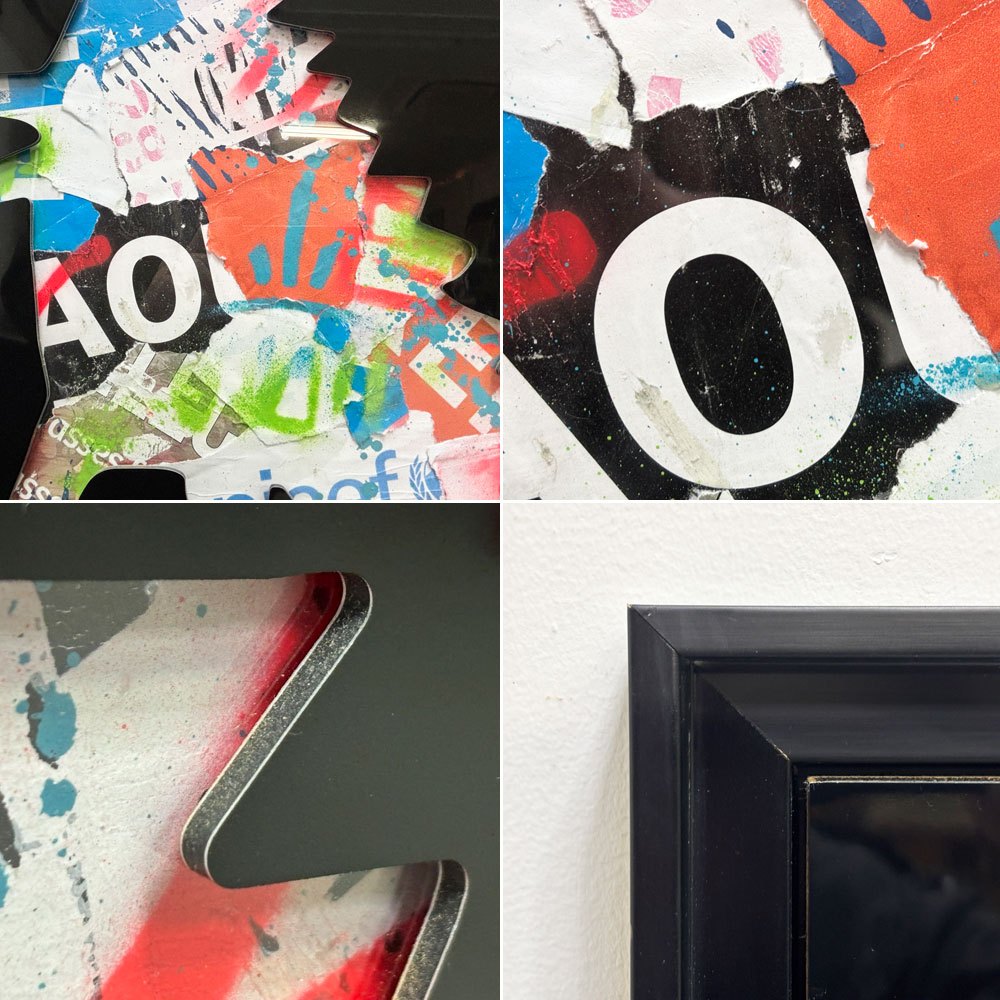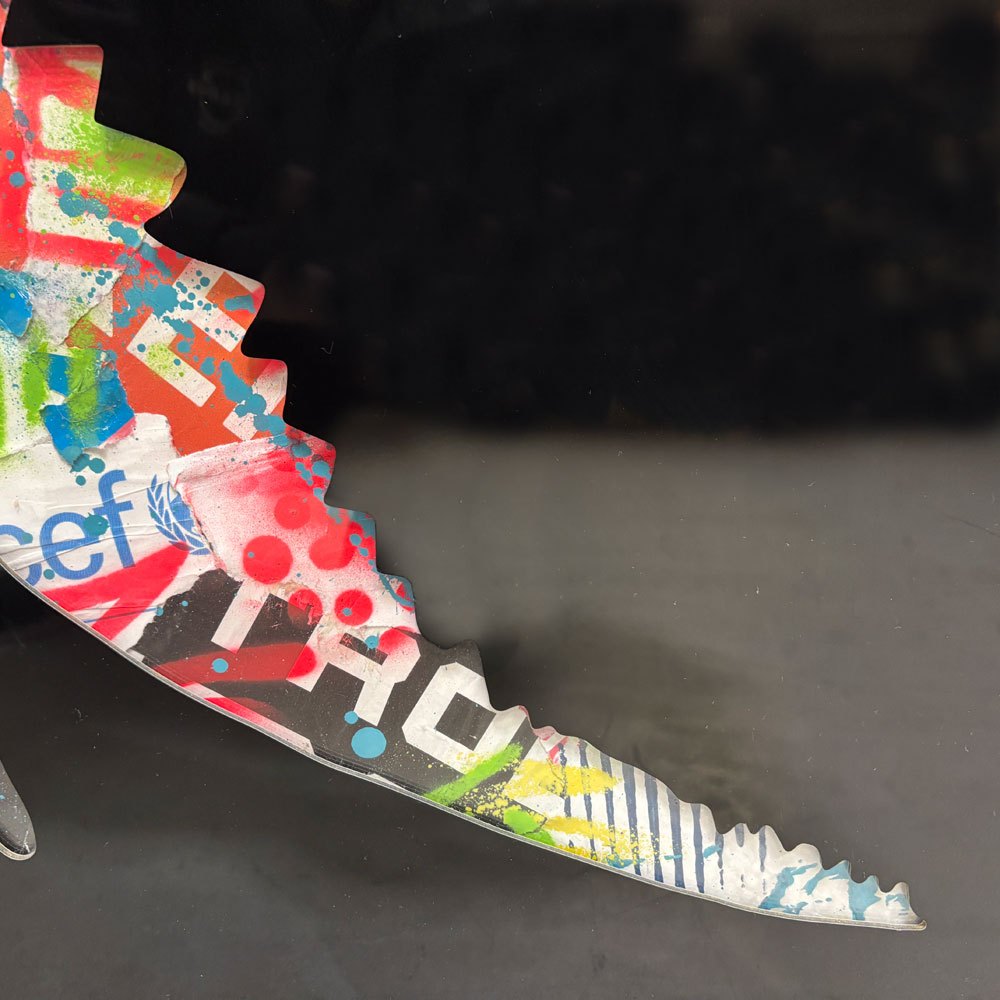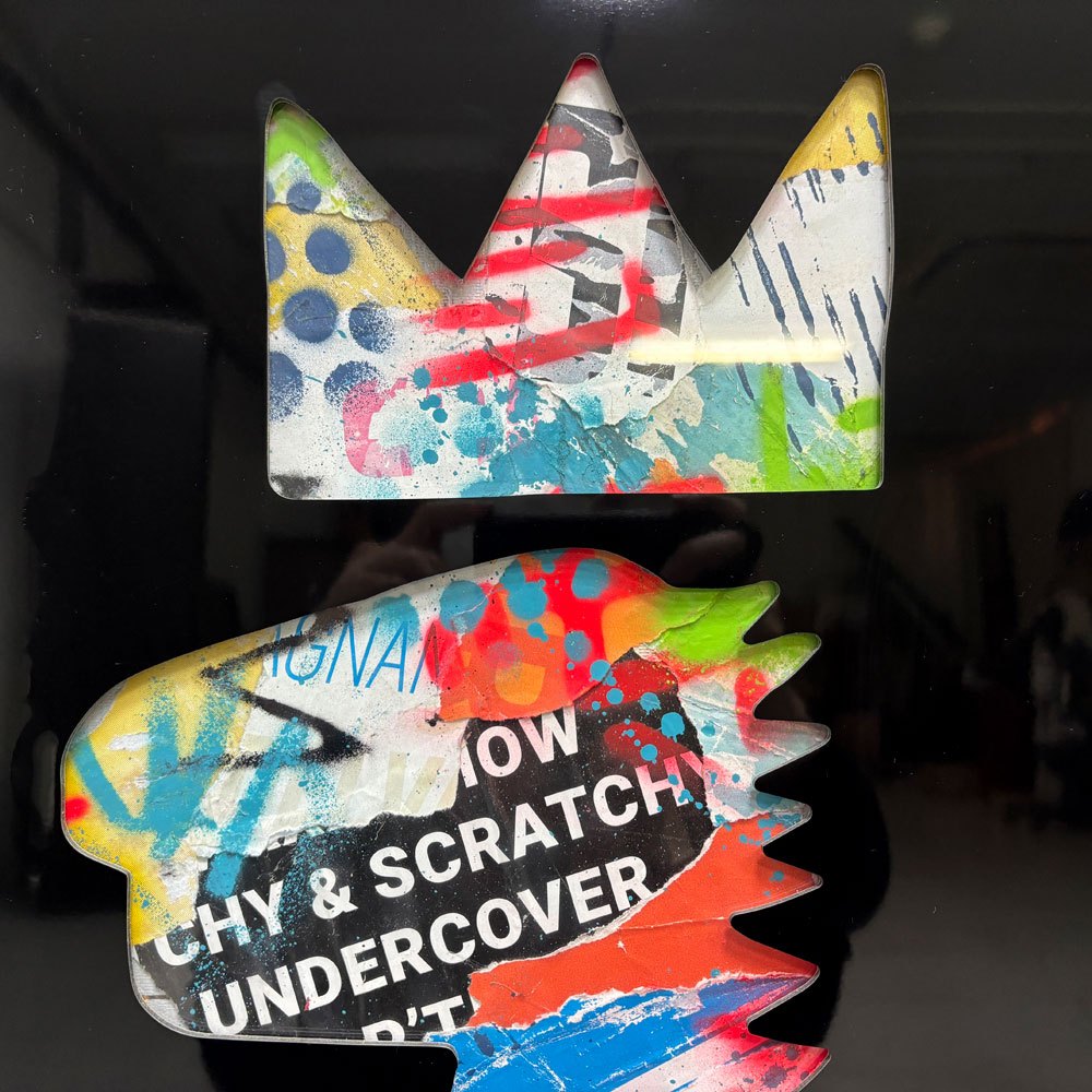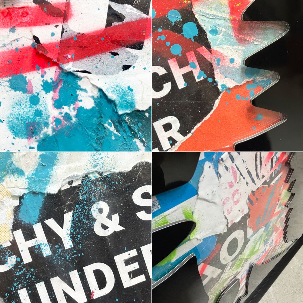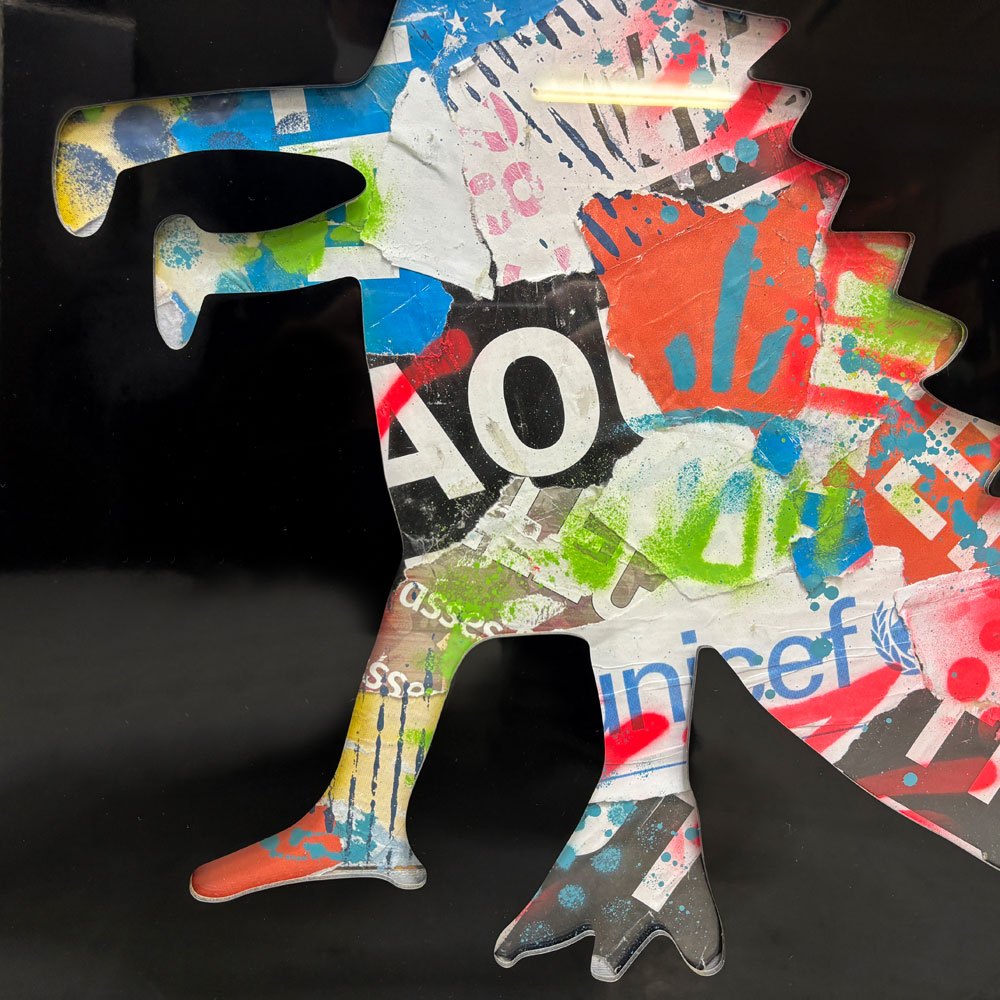 艶のある黒い背景をレザーカットで加工した王冠と恐竜。内部はコラージュ、ステンシルやドロッピング、樹脂等の美術技法を組み合わせたカラフル且つカオスな平面表現。ブラック色との対比により圧倒的な存在感を放ちます。くり抜かれたブラック背景による立体感も相俟って、他のストリートアートとは一線を画す高い完成度を生み出しています。