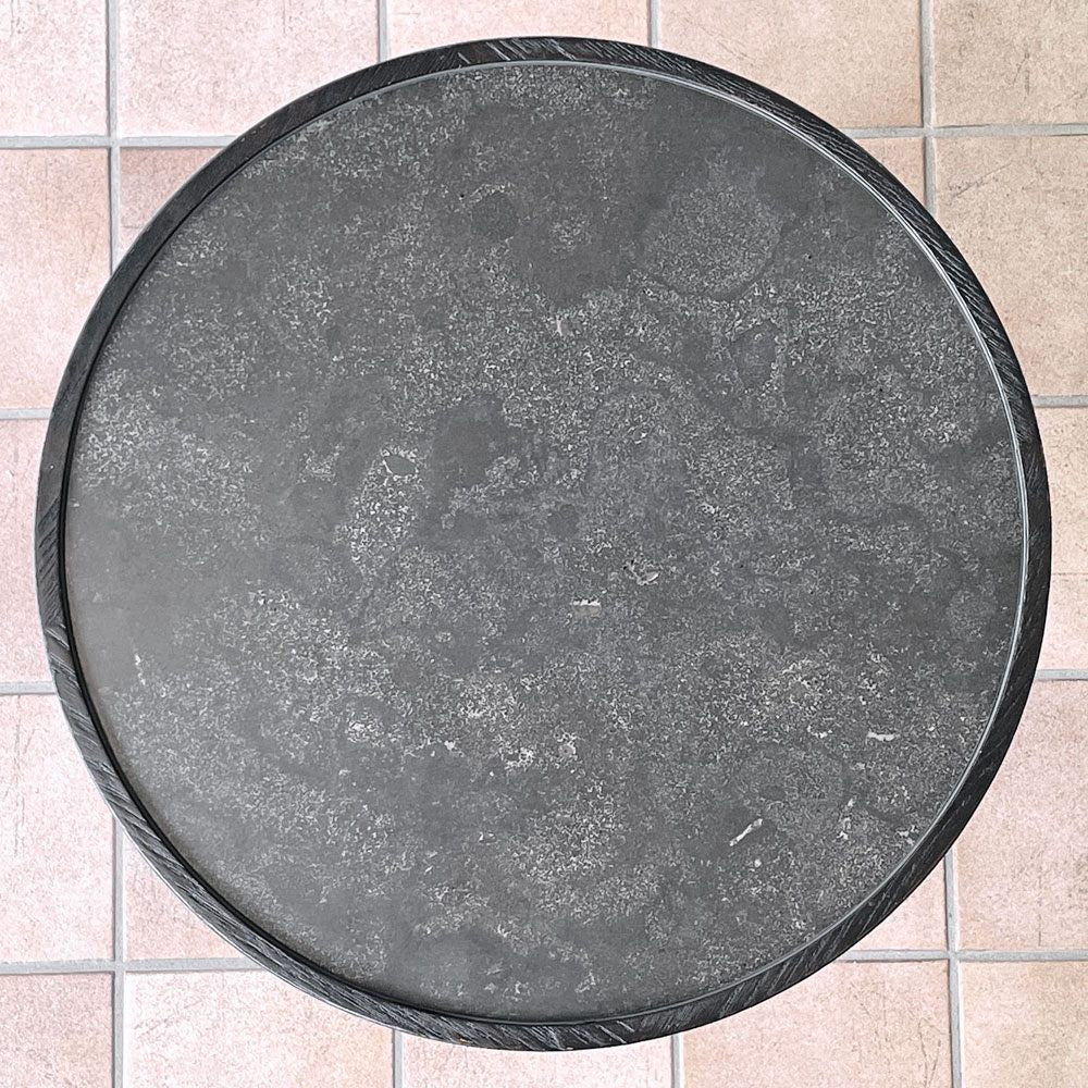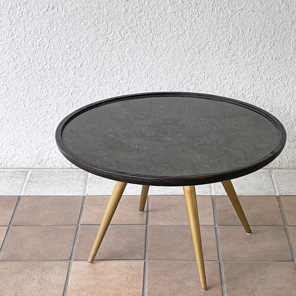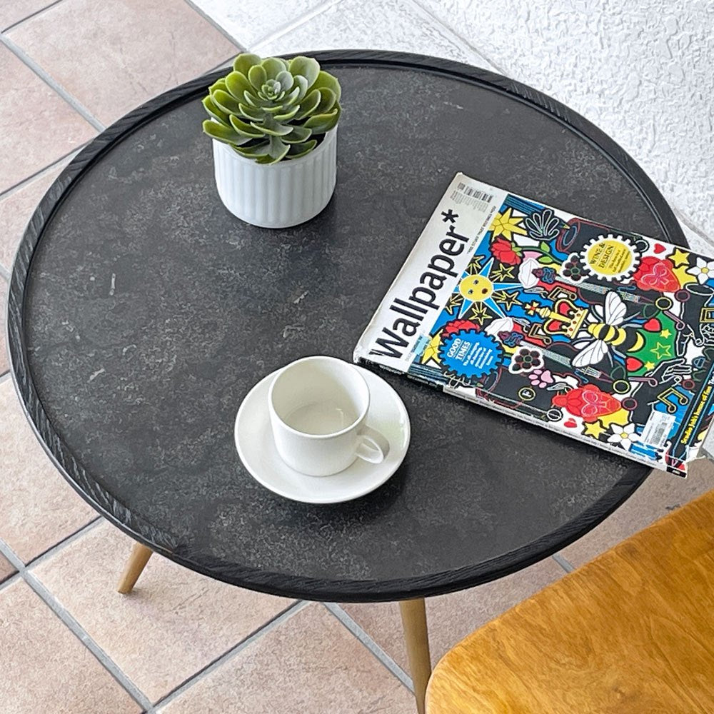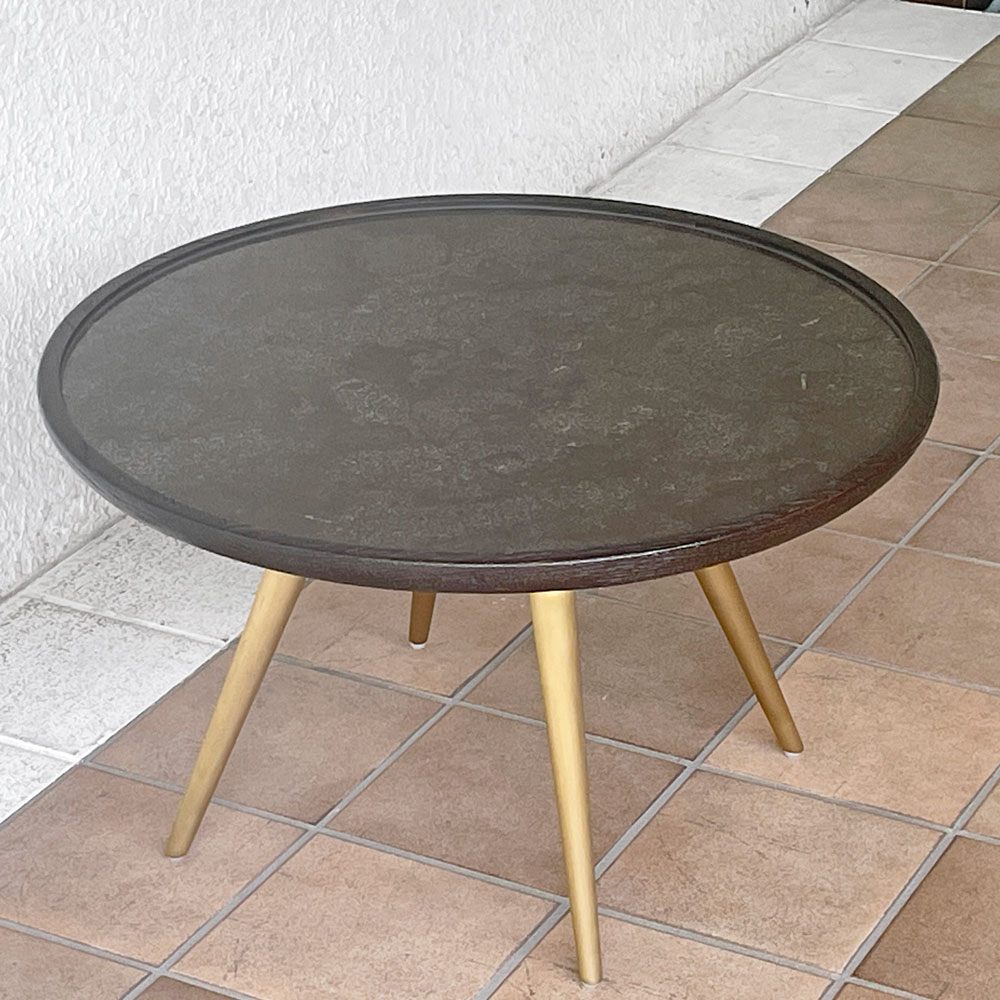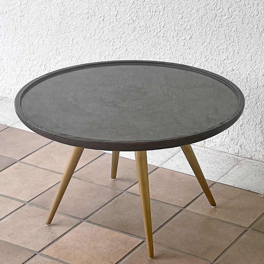 ラウンド型の石天板をオーク材で縁取りシックで大人びた雰囲気を演出するコーヒーテーブル。カップやペン等が落ちない様に機能的な工夫がされており、同時に凹凸による陰影の変化が楽しめます。