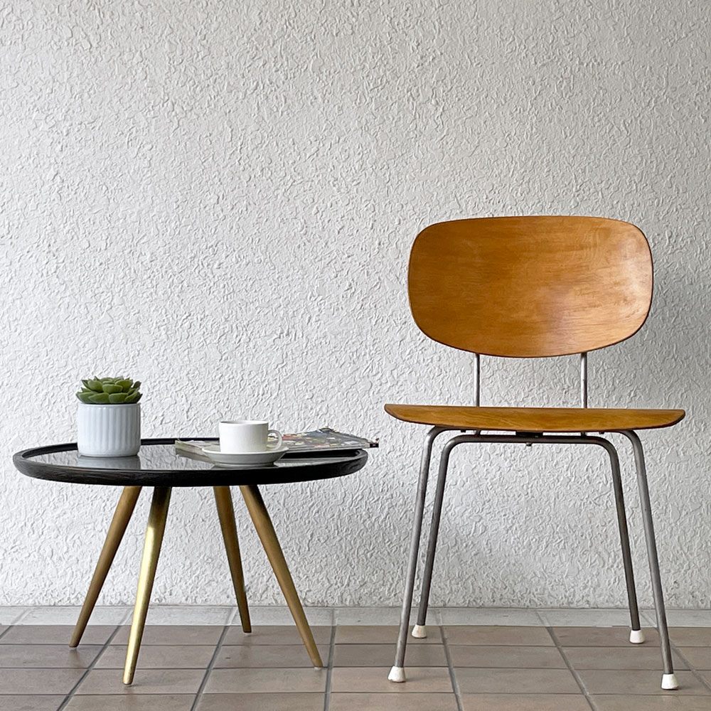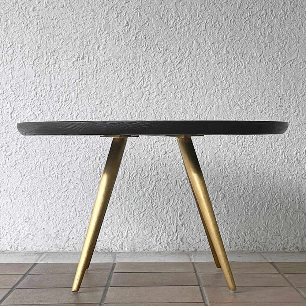 脚部はゴールドカラーのチタンメッキで塗装されたステンレスレッグを採用。ダークトーンの天板に対してコントラストが生まれ、ハノ字にひろがる直線構造が、安定感と共に全体の印象が甘くなり過ぎないようにシャープな雰囲気を加えています。