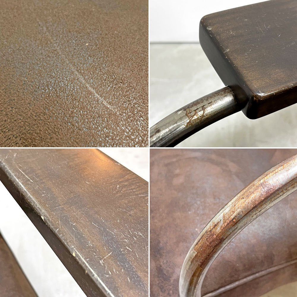 こちらはビンテージ加工を施したお品物です。使用に伴いレザーに擦れや若干の毛羽立ち、取り切れない汚れなどが見受けられます。また、アームに線傷や打痕、フレームには金属特有のくすみや錆びなどの加工が施されており、風合いとしてお楽しみ頂けるコンディションを保っております。