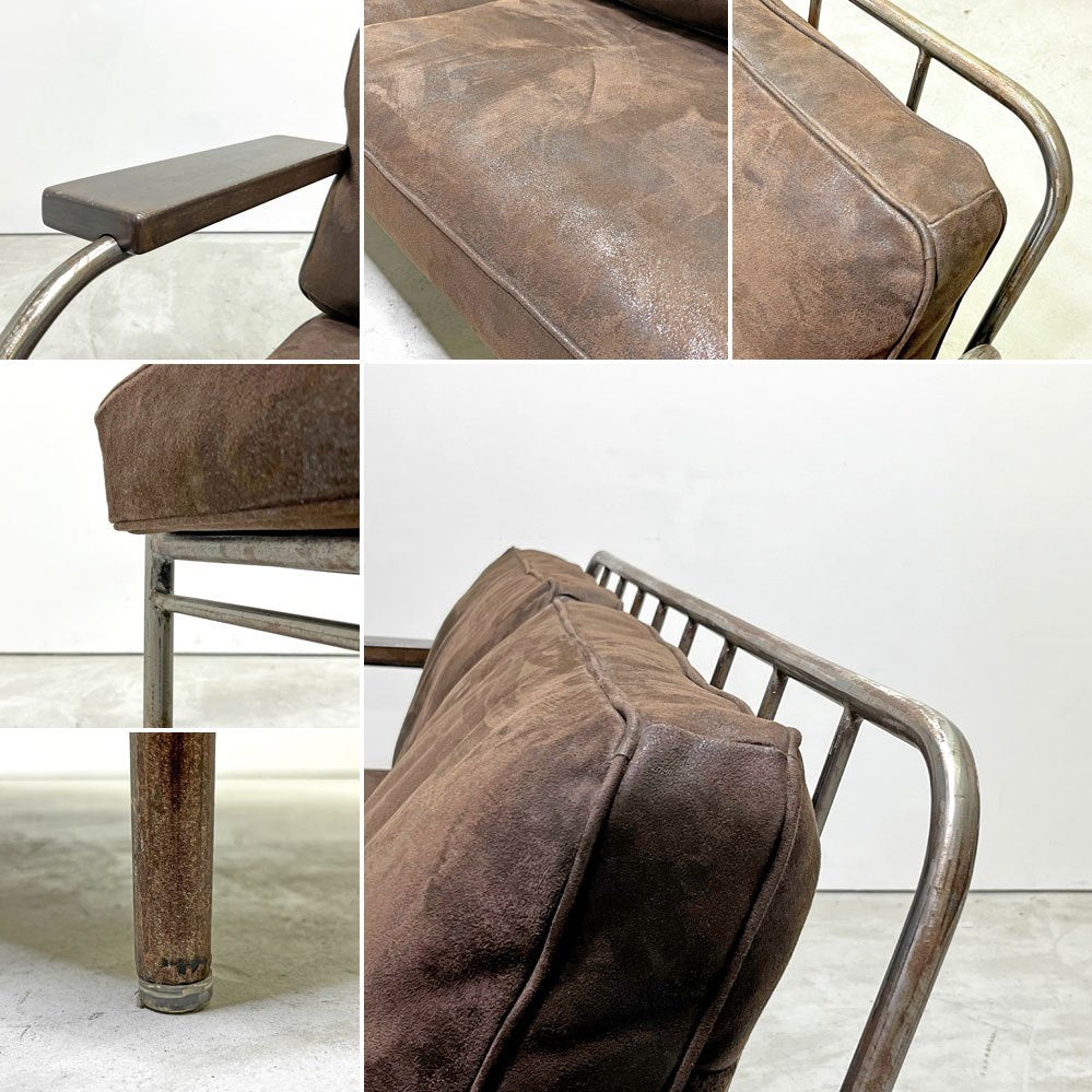 ダメージ加工を施した無機質なスチールフレーに対し、経年によりシワや艶感等味わいを増していくヌバックレザー(牛革)を組み合わせ、肘掛けにはラバーウッド材を使用した異素材ミックスのソファ。シック且つカジュアルな印象を醸し出すダークトーンの色合いと素材のバランスは、ジャーナルスタンダードらしさが際立ちます。