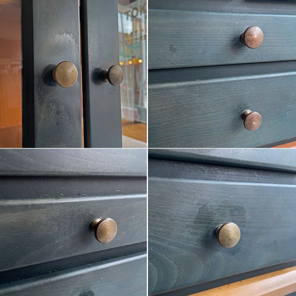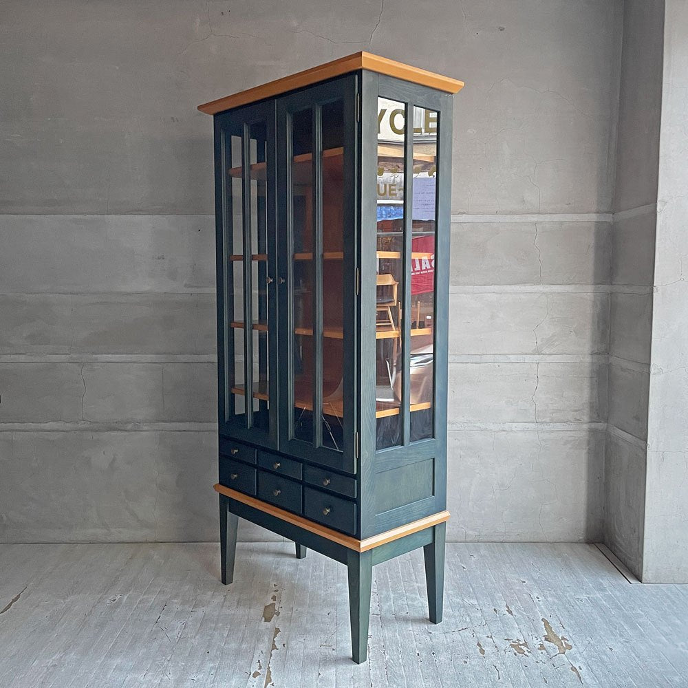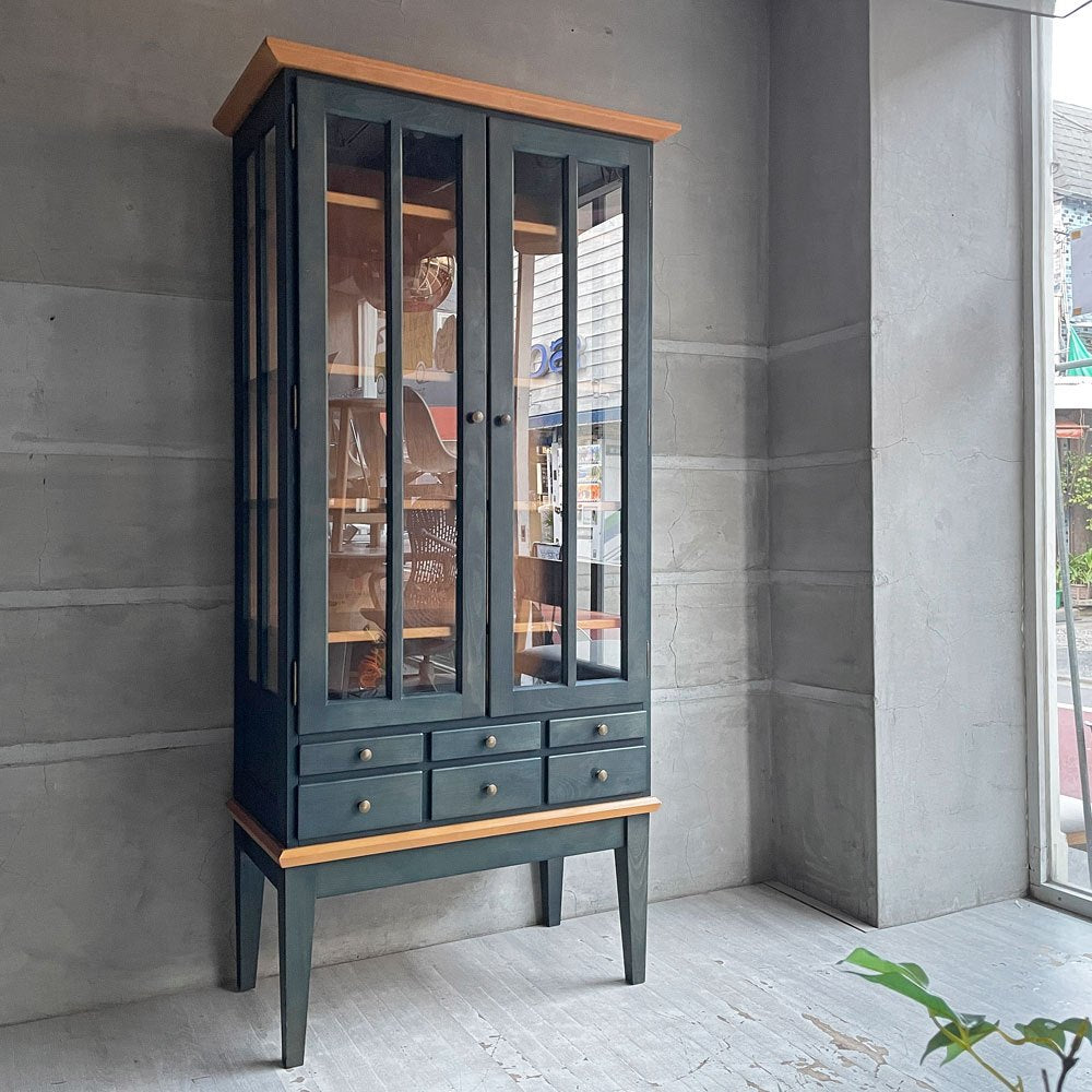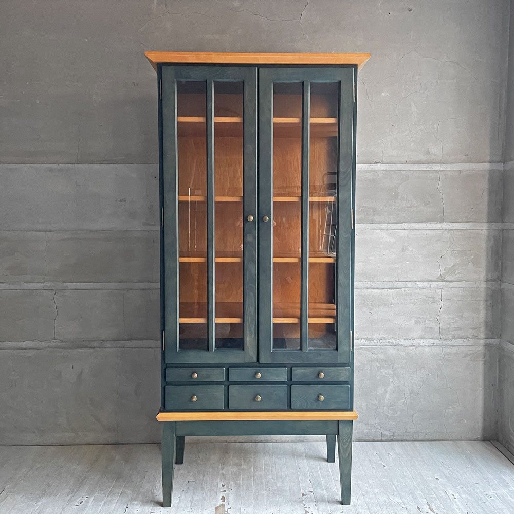 木材はキメ細やかな杢目が特徴のビーチ材を使用。本体はネイビーカラーとグリーンカラーが合わさったかのような深い色合いとなっており、天板と棚板はナチュラルカラーと、2トーンのカラーで仕上げられたキャビネットです。また、アンティーク調のハンドルを使用することでさり気ない高級感を演出しています。