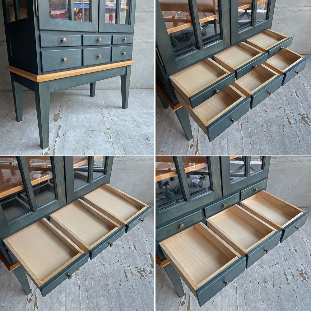 ガラス扉の下には、抽斗が6杯備わっており、小物の収納も可能。上下で抽斗の深さが異なり、上段の方が浅めの設計になっています。