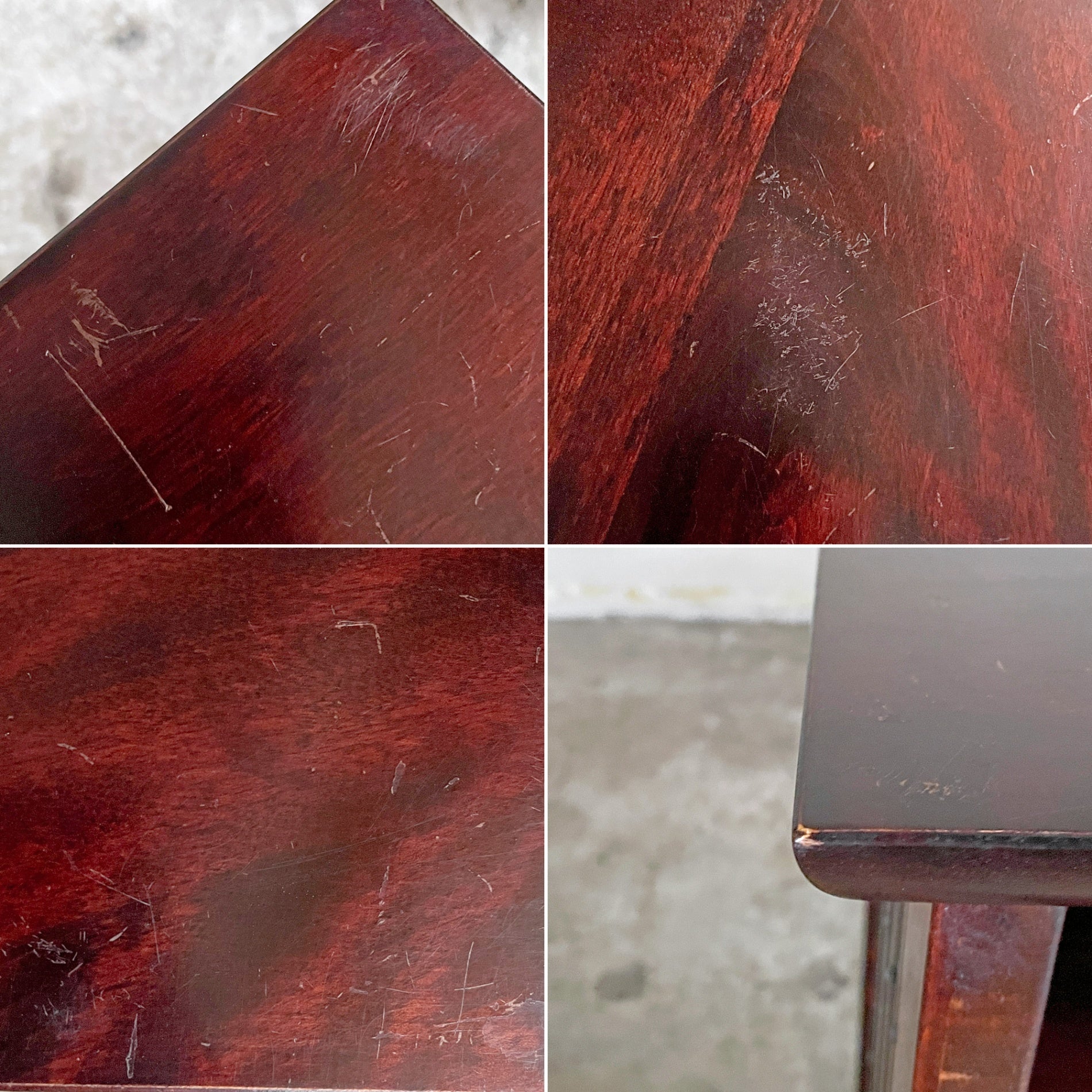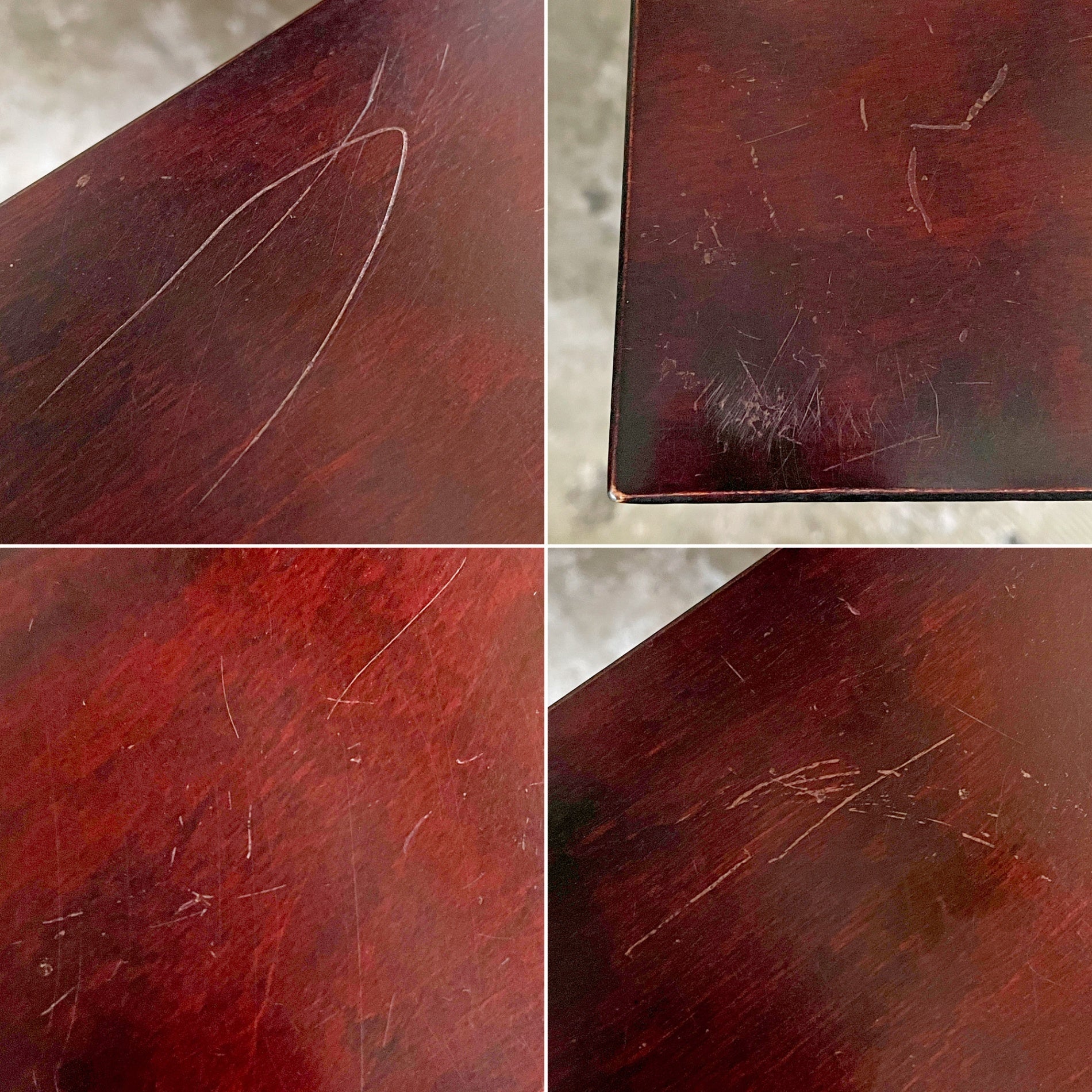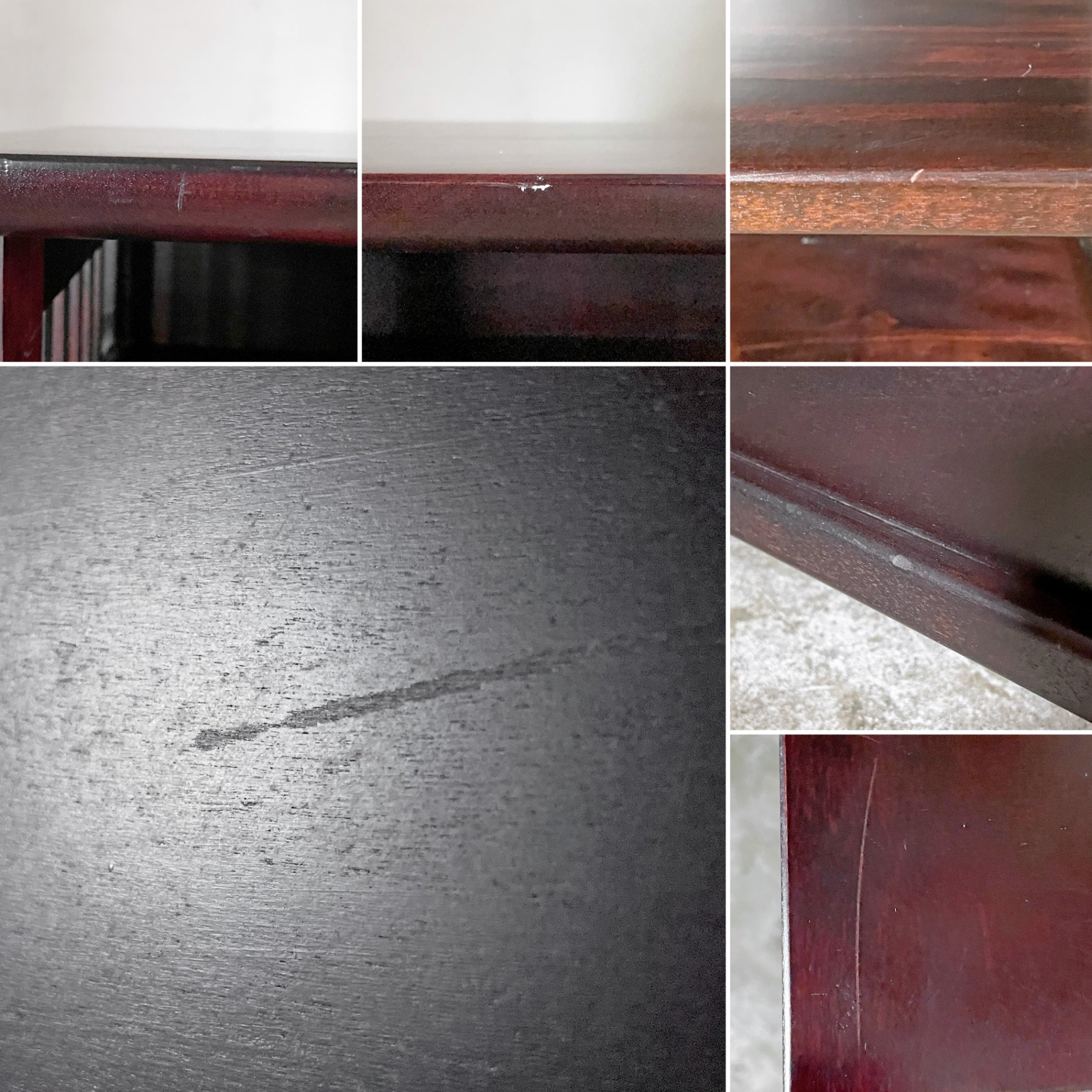 使用に伴い、擦れや傷、細かな打痕が天板を中心に散見されます。使用に問題となるがたつきやぐらつきは見られず、これからも安心して実用いただけるコンディションを保っております。