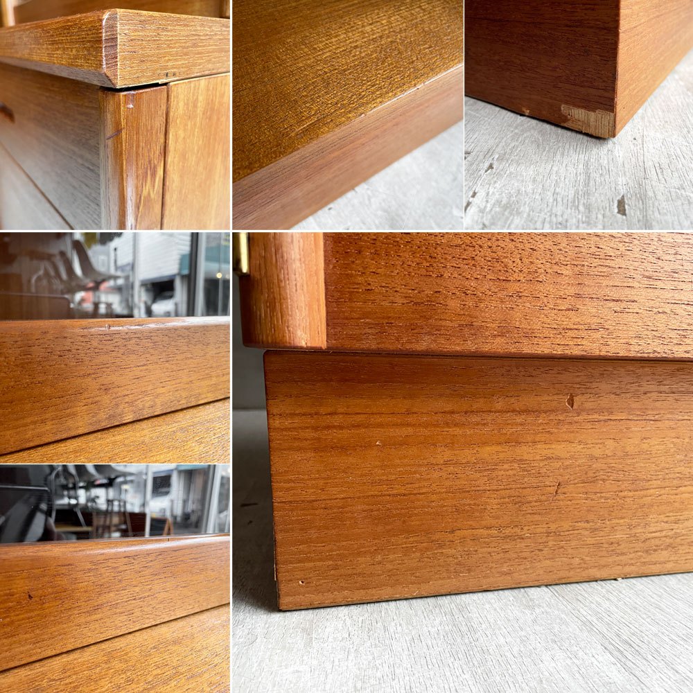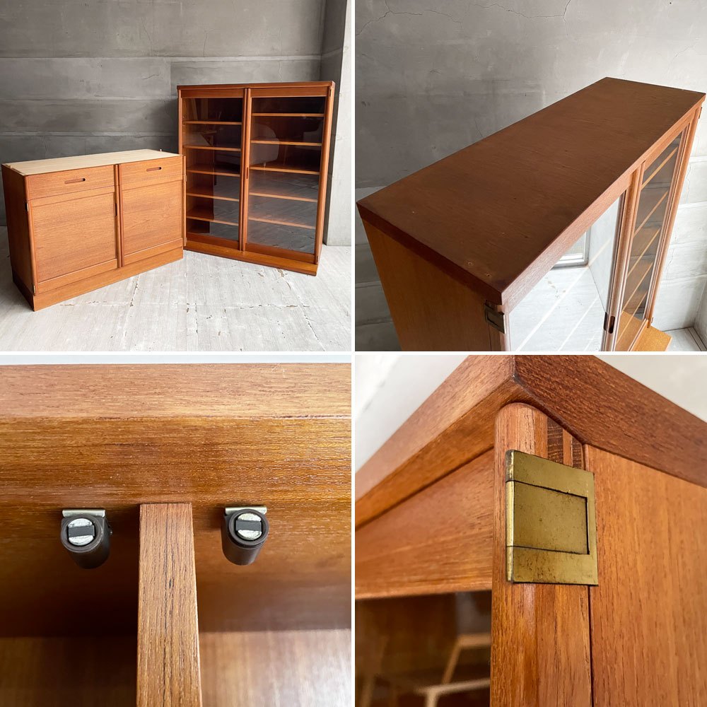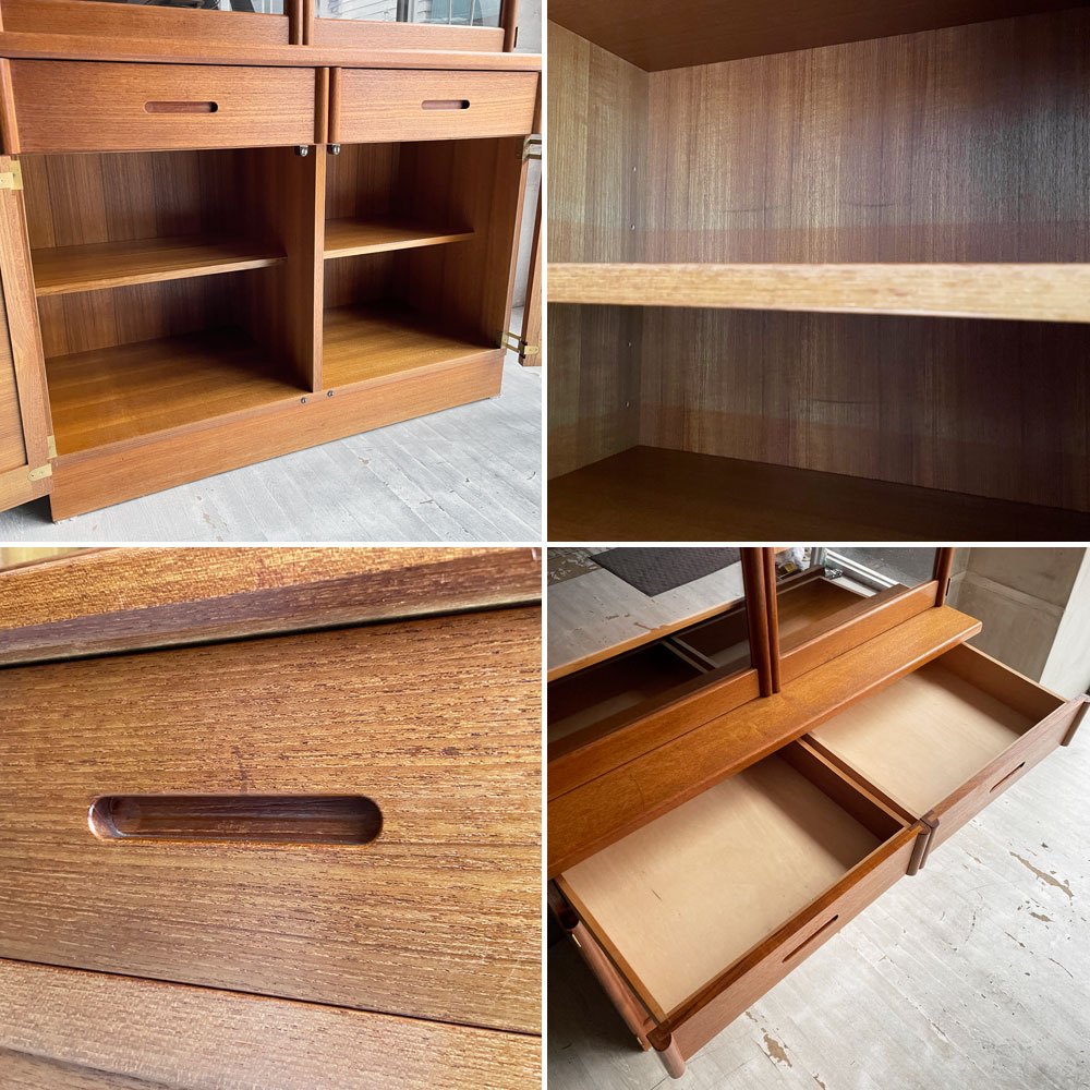 コチラのお品物はビンテージ品となります。使用・経年に伴う傷や擦れ、色ムラやペイントロス、ベース部分の突板の剥がれ、軽微な汚れや日焼け痕などがございます。また、向かって左側のガラス扉内部の下から三段目のダボ穴に折れたダボの先端が埋まって取れなくなっており、この箇所のみ棚板の設置が出来なくなっています。その他、大きく美観を損なうようなダメージなどもございません。これからも安心してお使い頂けるお品物となっております。