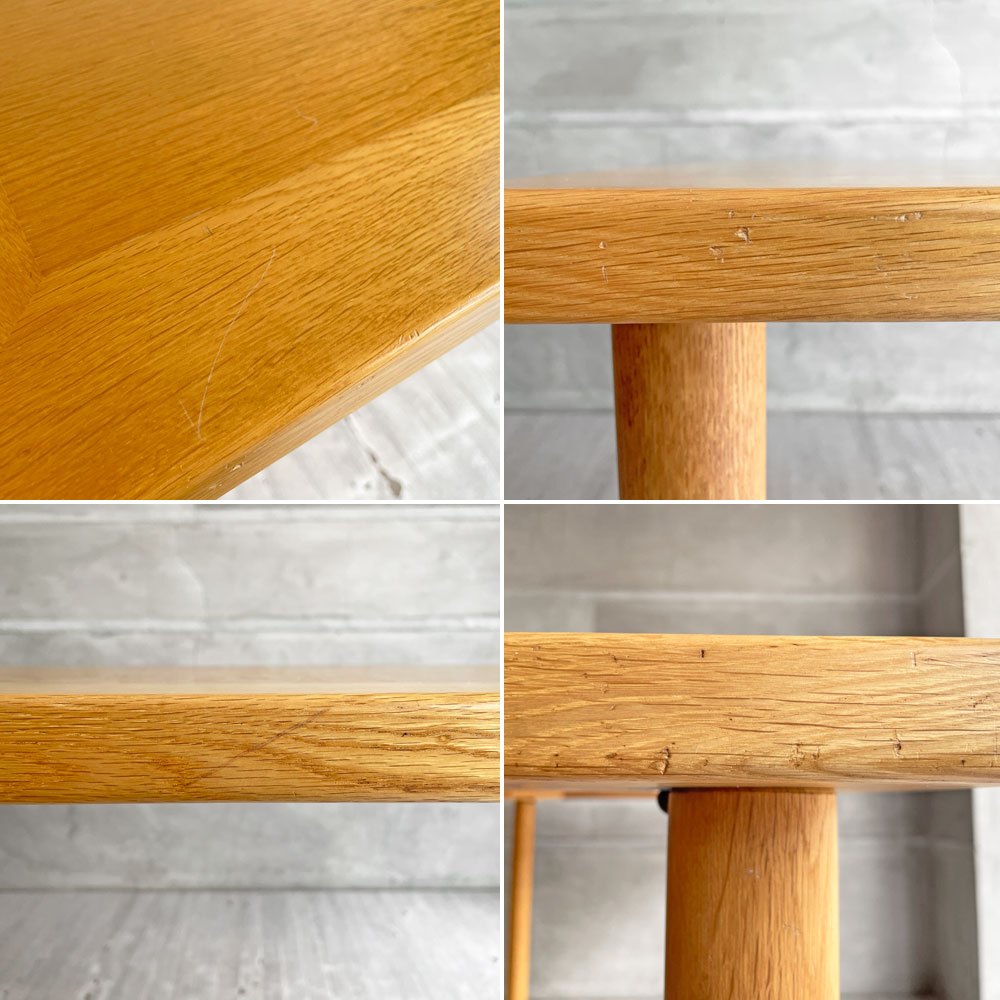 使用に伴う傷や擦れ、色ムラやペイントロスなどが複数見受けられます。また、天板の両端に日焼けによる変色、天板表面に亀裂の生じている箇所がございます。多少の使用感はございますが、ガタつきやグラつきなども無く、ご使用に問題となるようなダメージなどもございません。これからも安心してお使い頂けるコンディションを保っております。