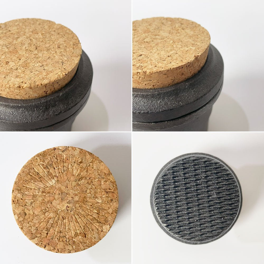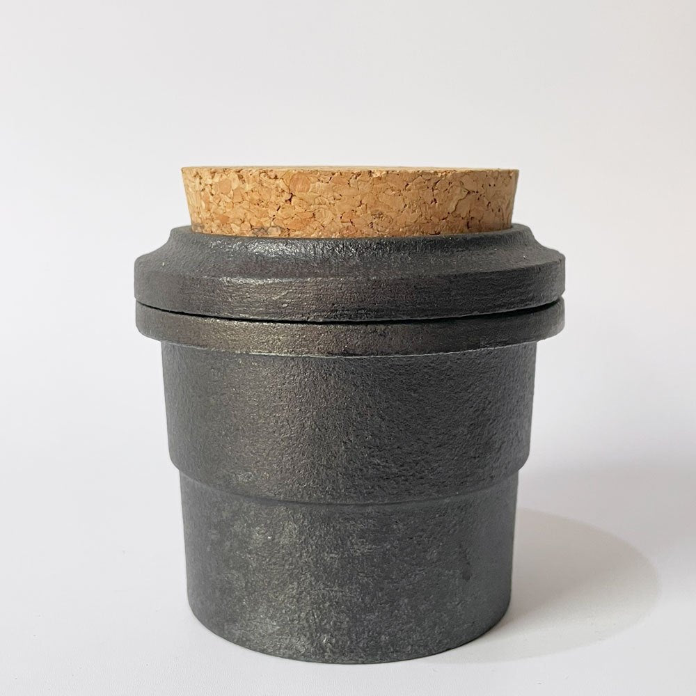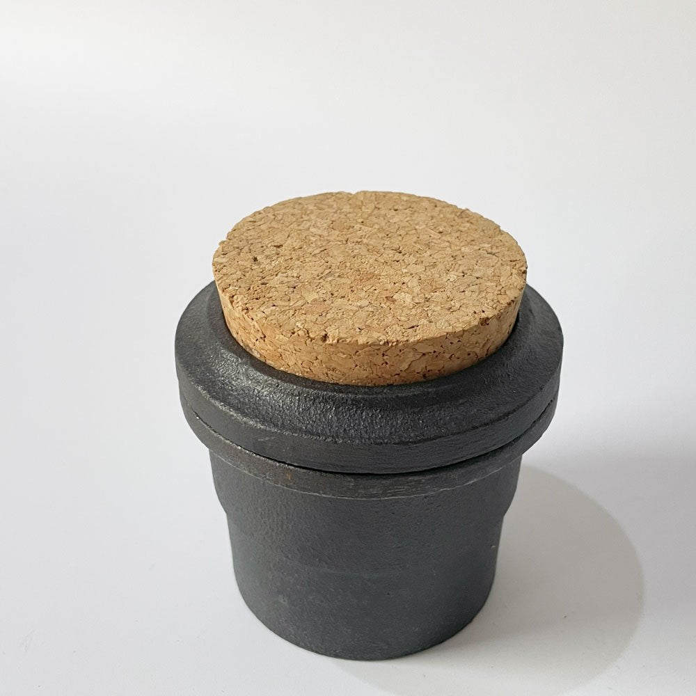 下段にスパイスを入れ、鋳物の重さですりつぶし、コルク栓付きの上段に移して保管可能。
