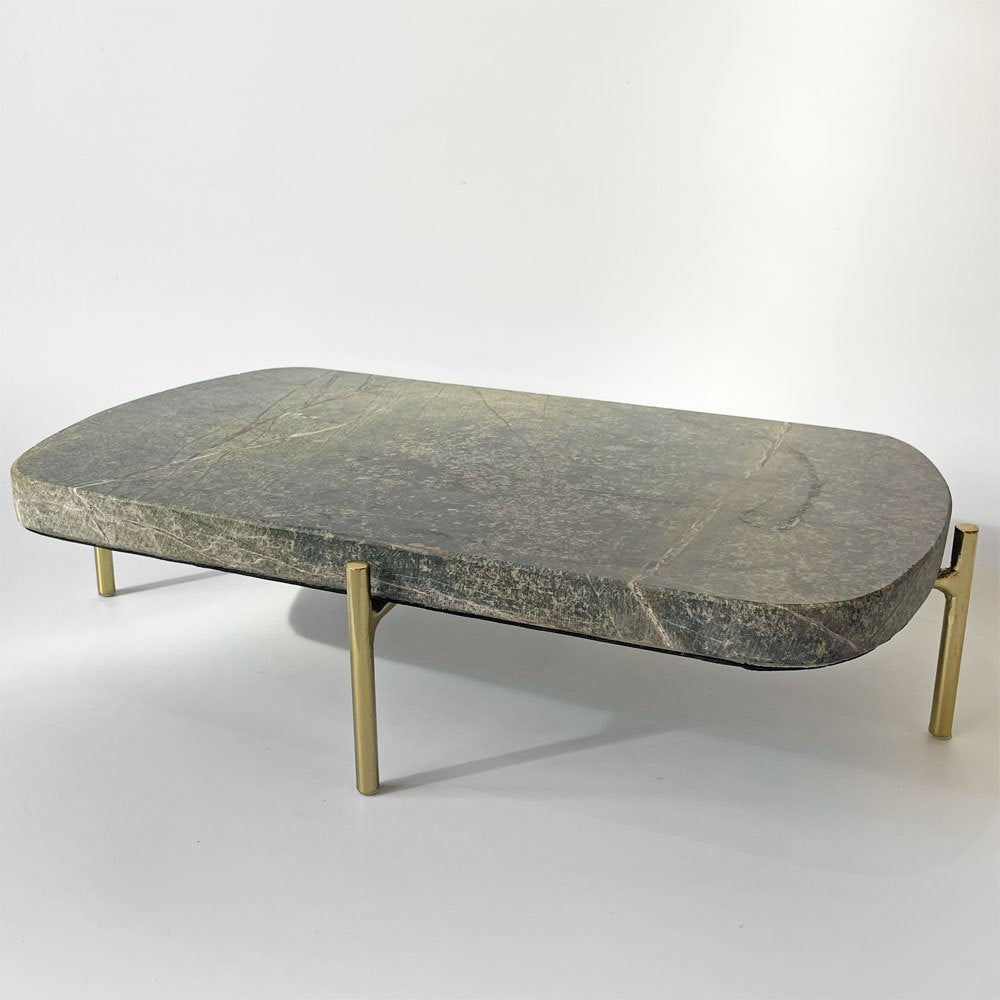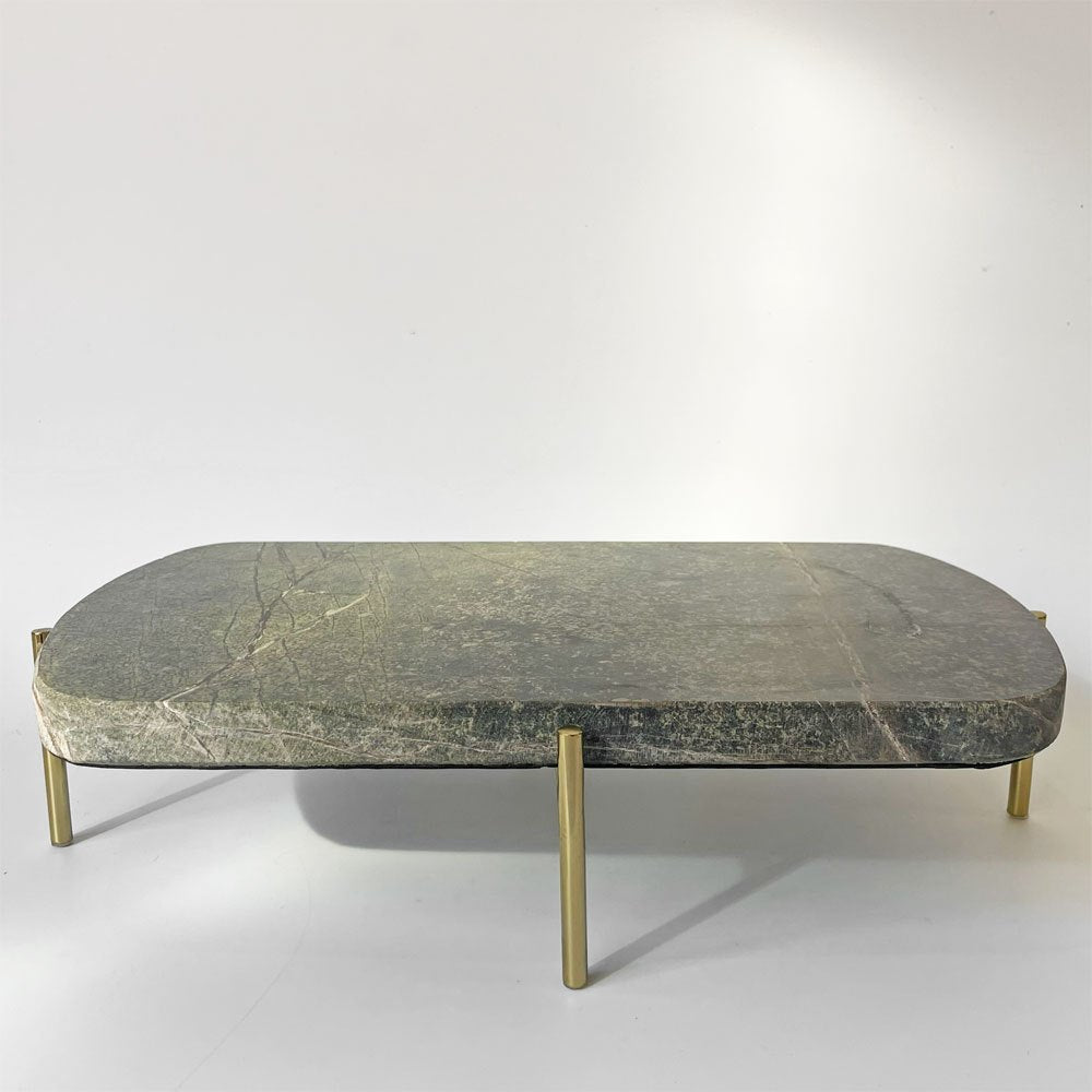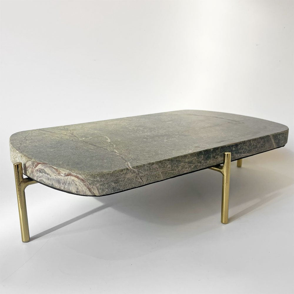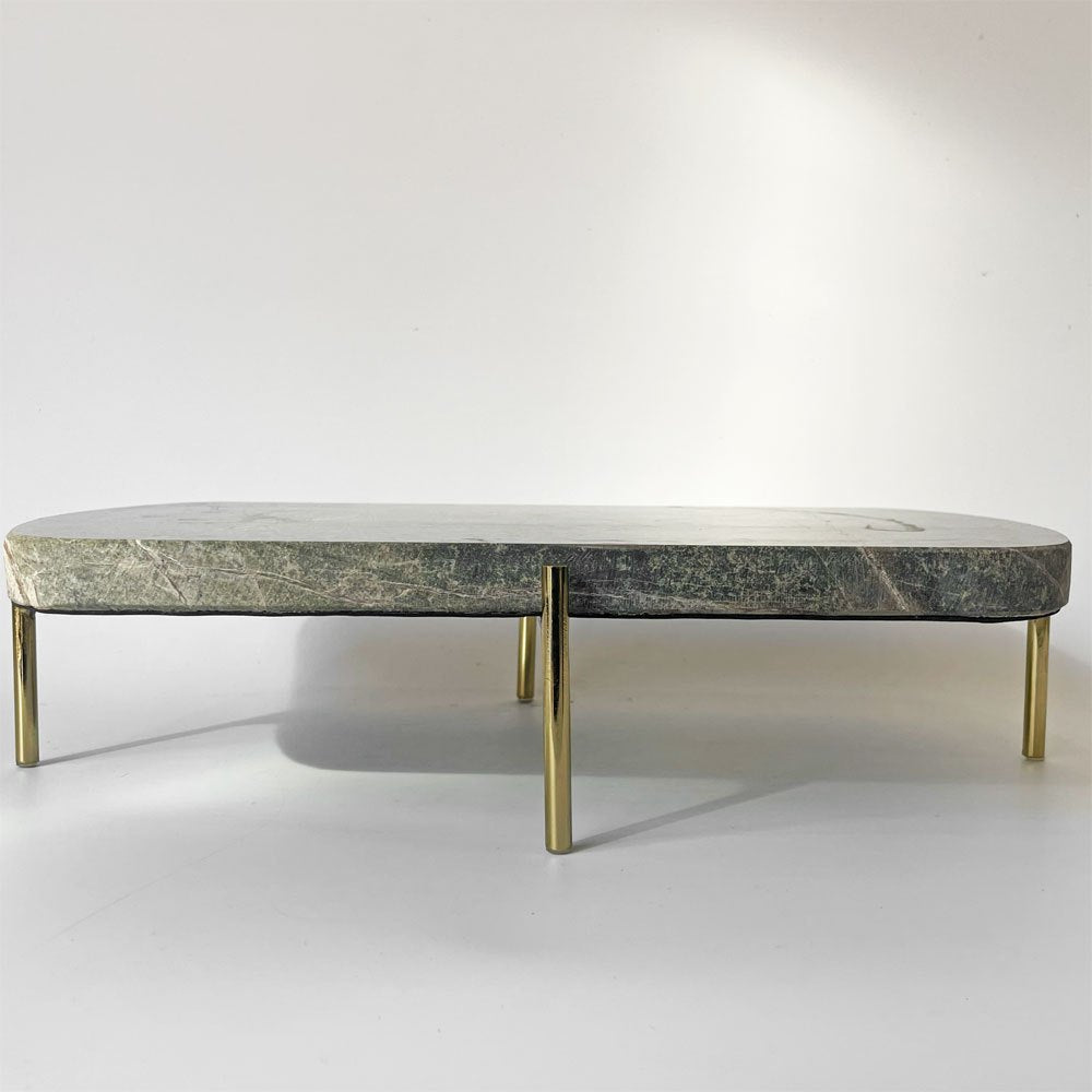 深みのある緑色を帯びた天板と真鍮製の脚部が魅力的。